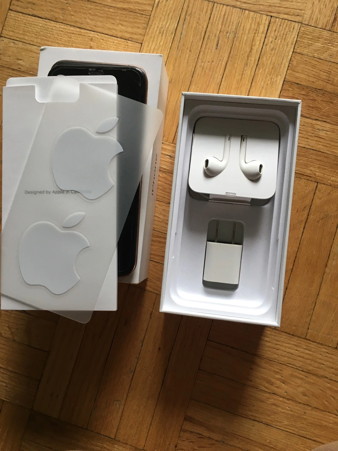 Comes with original box, headphones (without adapter) and the charging wall adapter but not charging cord. As well as phone case showed if you are interested.