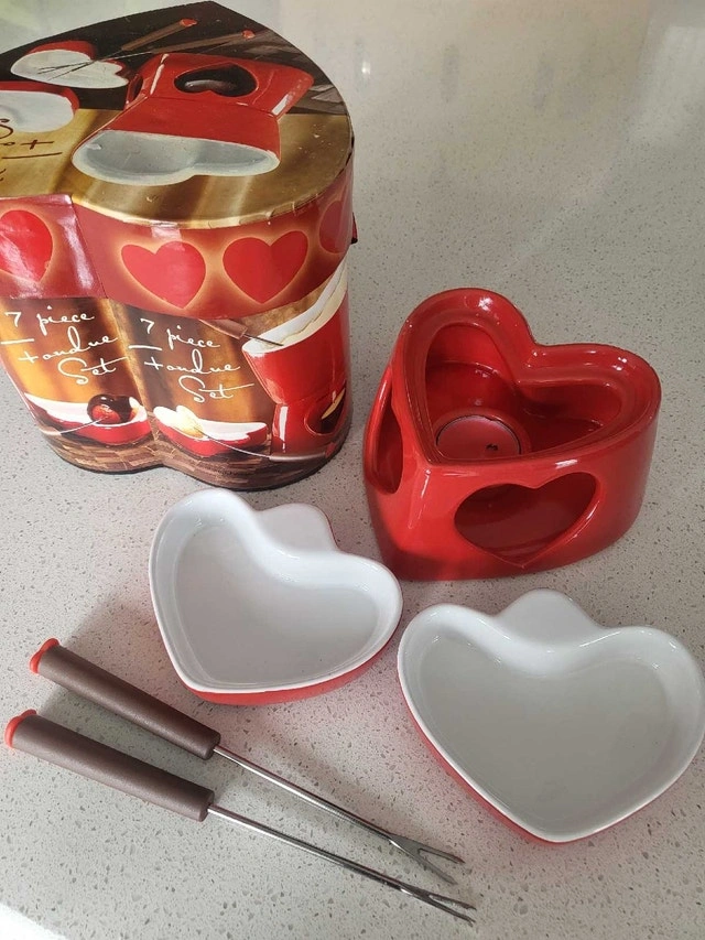 This is a heart-shaped fondue set, perfect for a romantic night in. The set includes a fondue pot, two heart-shaped serving dishes, and two forks. It is in excellent condition, only used once! Ready to create delightful chocolate or cheese fondue experiences. Features a heart-shaped design and includes the pot, dishes, and forks. If the ad's still up, it's still up for grabs!