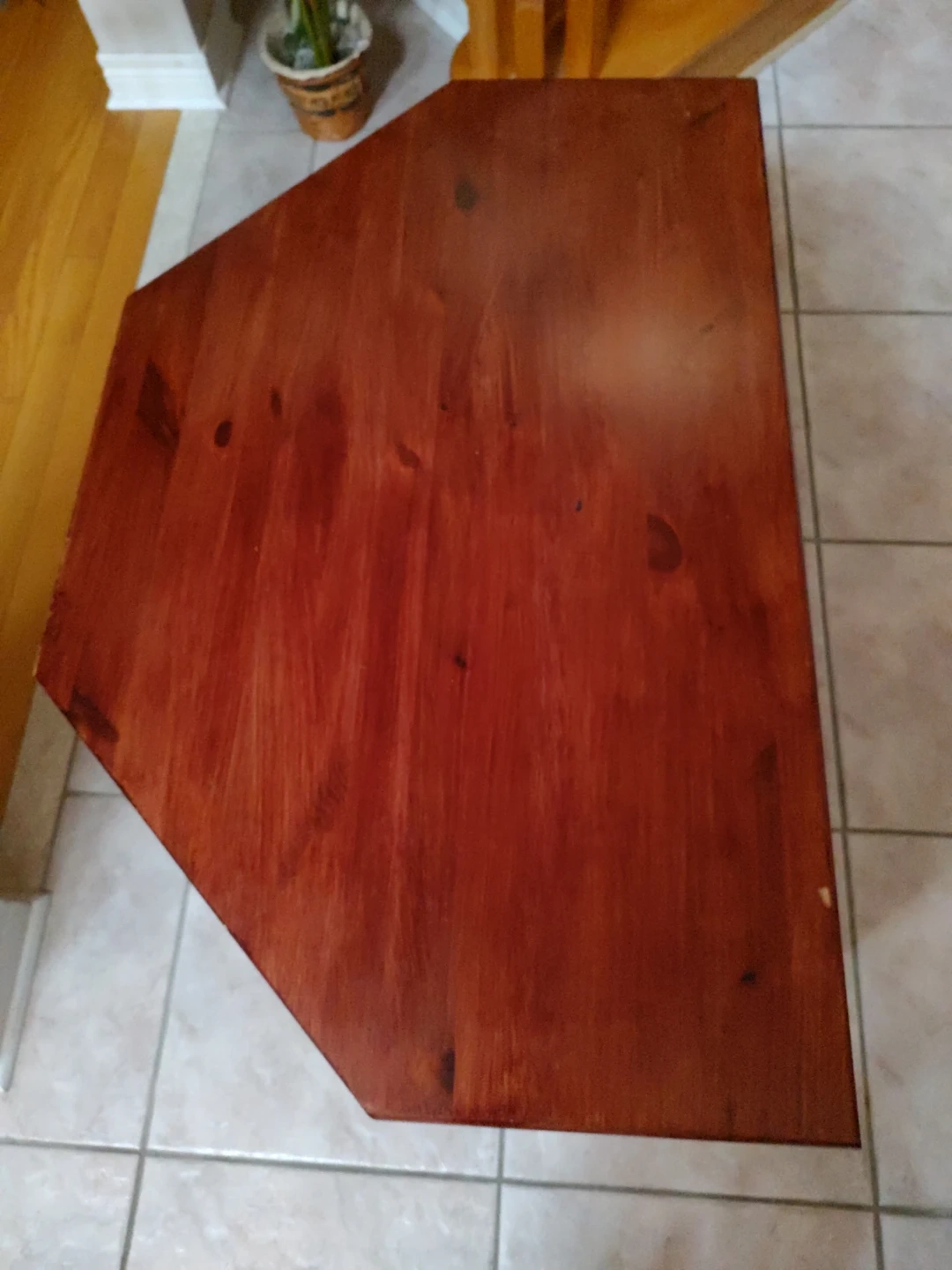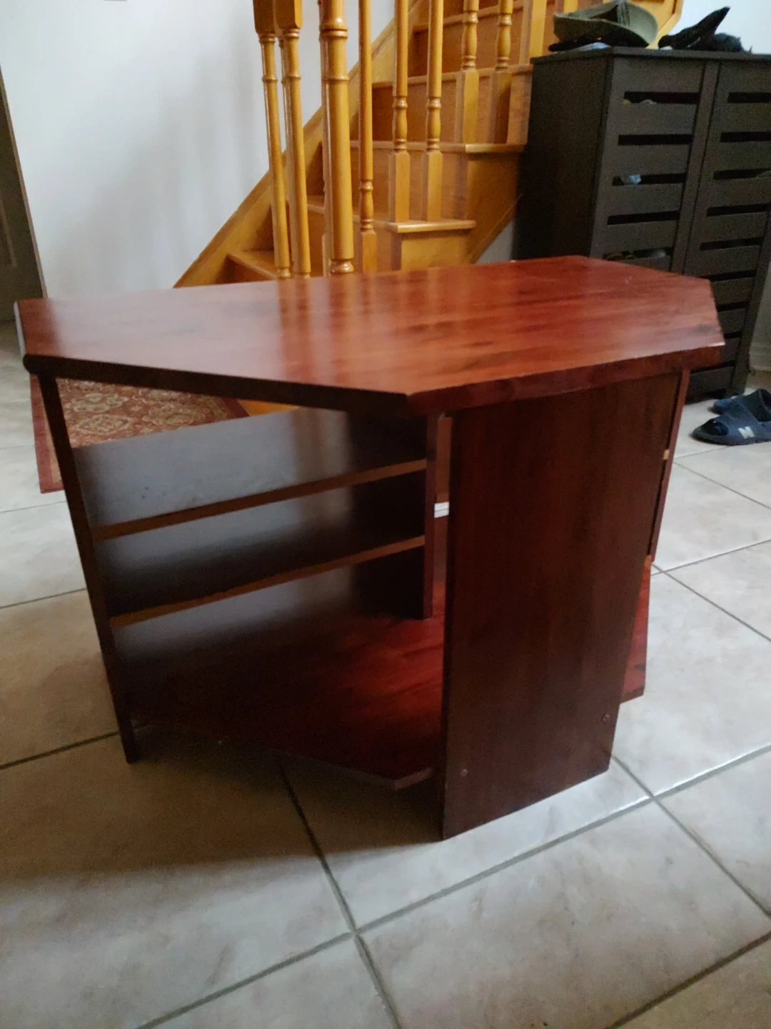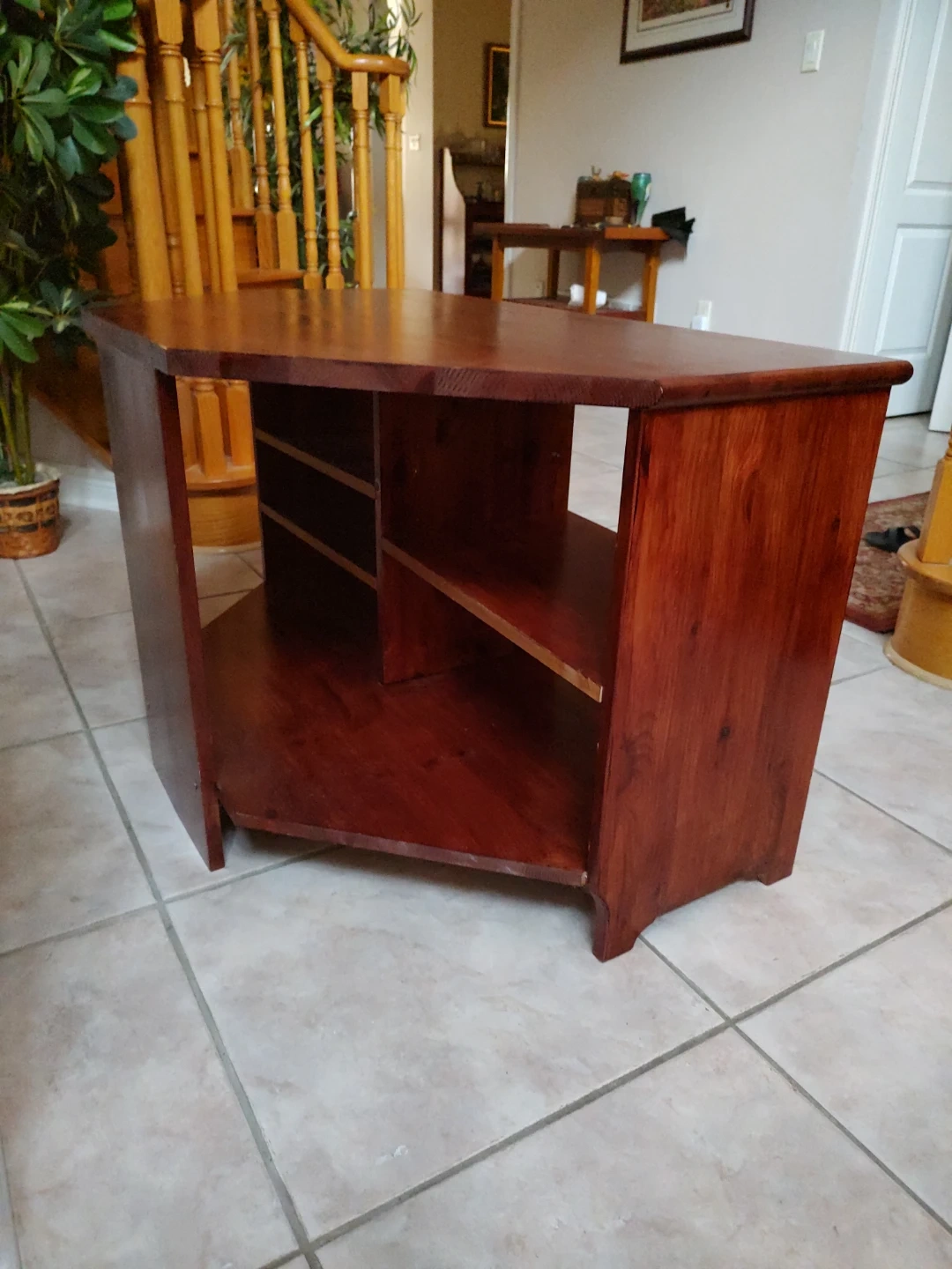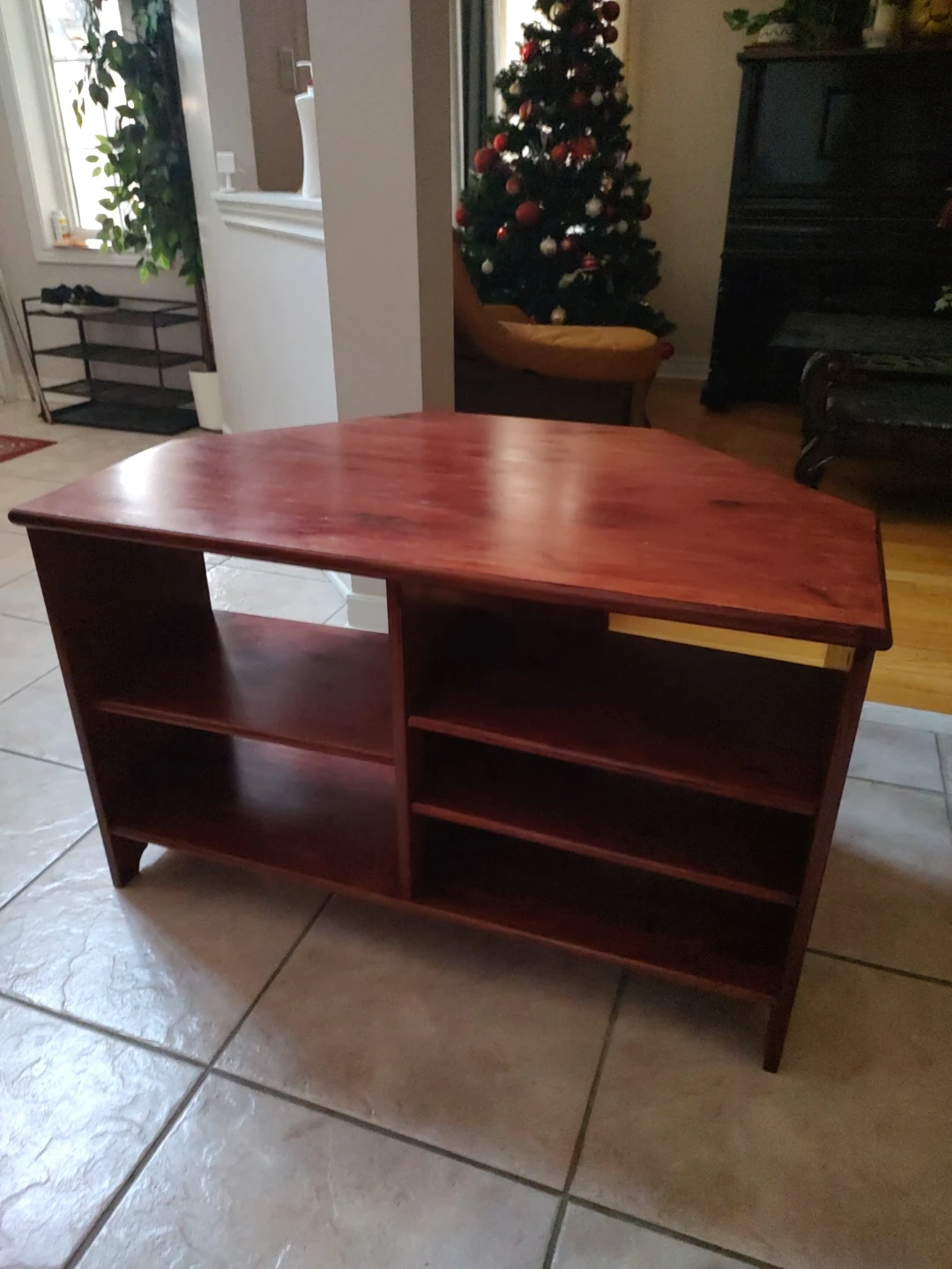 Here's a wooden corner TV stand that's perfect for smaller spaces! The stain on it is not perfect and there are some scuff marks. One of the pegs is missing for one of the shelves. To enhance it, it may need some sanding and some new stain, but overall okay condition.