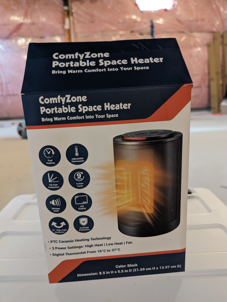 Black ComfyZone Portable Space Heater with 3 heating levels and a fan setting. Includes a digital thermostat for temperature control. This unit features an anti-tip switch for safety. Suitable for home, office and other personal spaces.