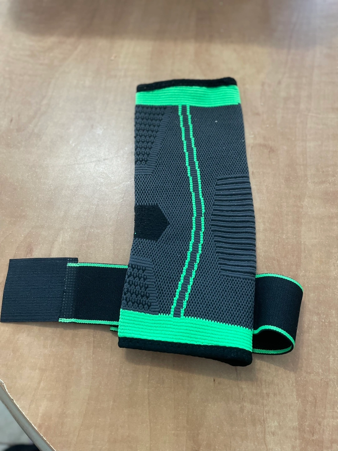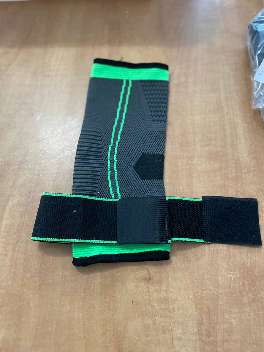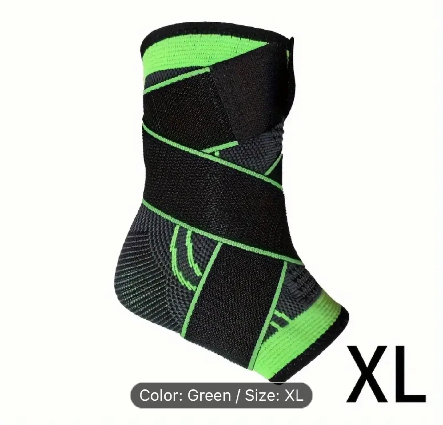 Ankle support brace, size XL. Black and neon green. Adjustable straps. Great for sports or recovery.