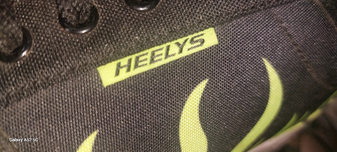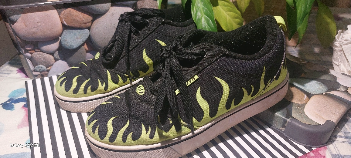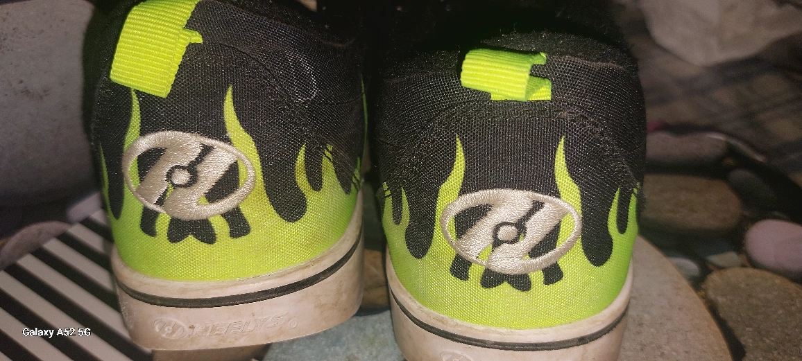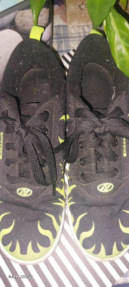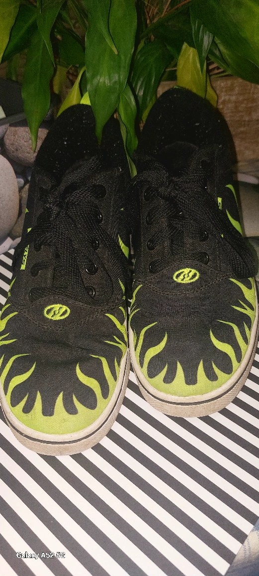 Selling a pair of Heelys roller shoes in black with green flame details! They're in good used condition and ready for some fun rolling adventures. Perfect for kids or adults who want to add a little excitement to their footwear