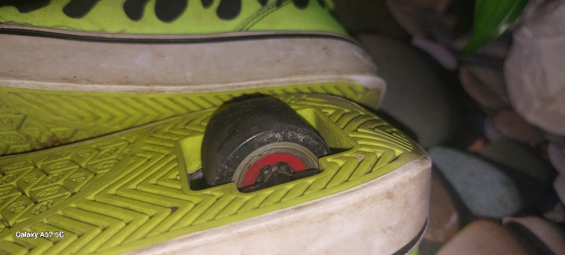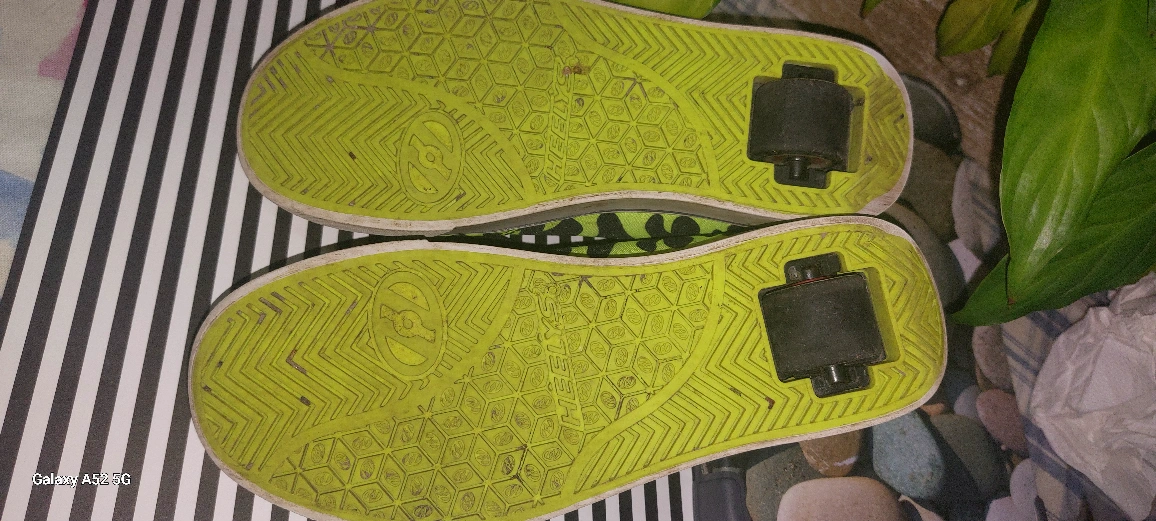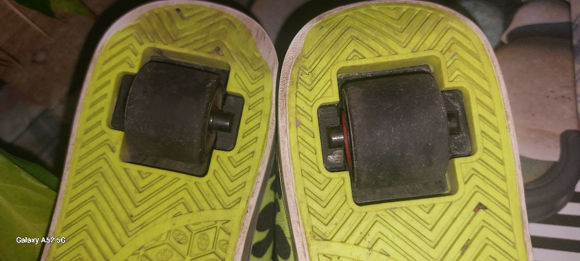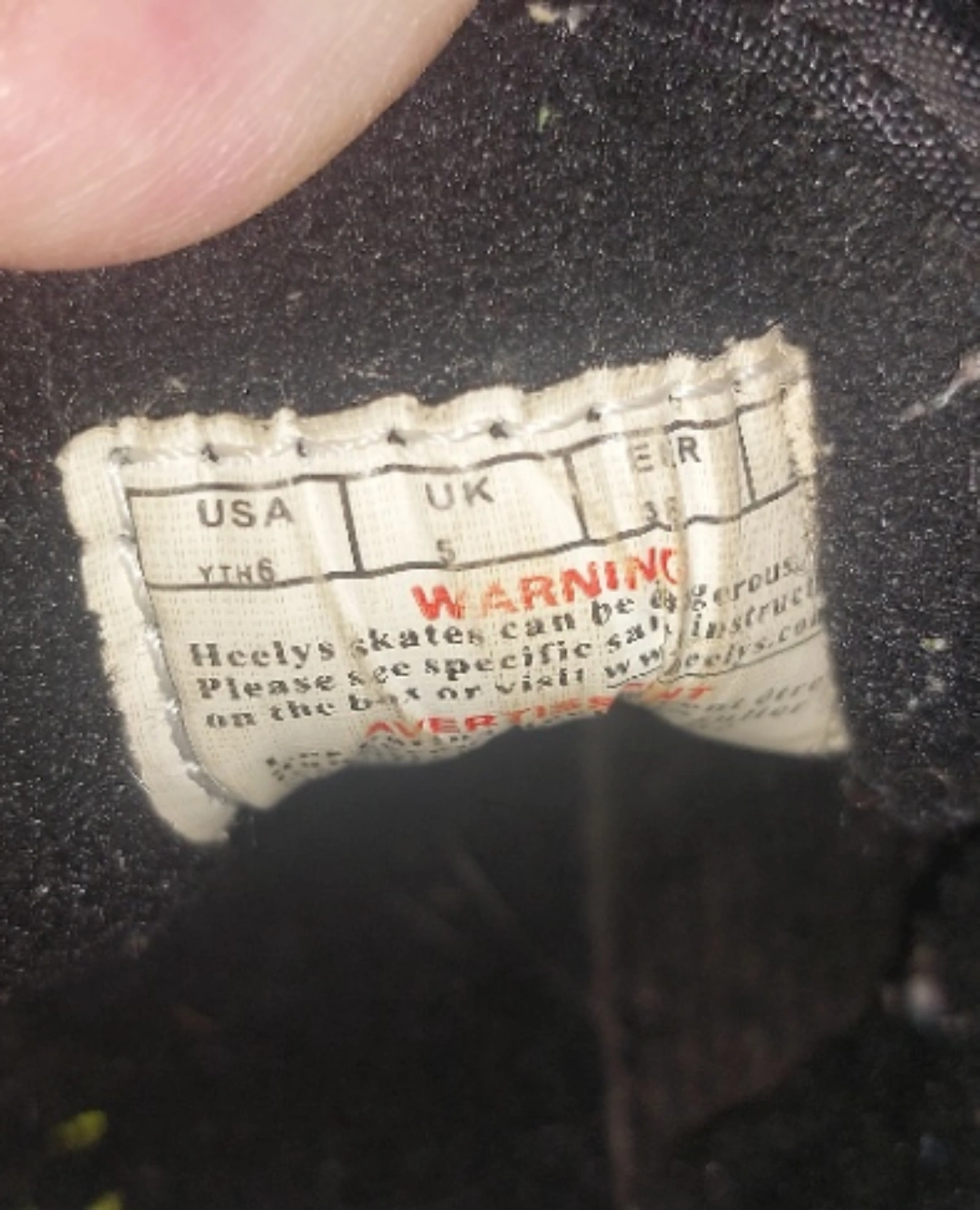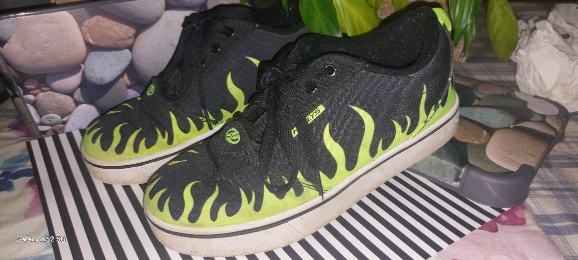 Selling a pair of Heelys roller shoes in black with green flame details! They're in good used condition and ready for some fun rolling adventures. Perfect for kids or adults who want to add a little excitement to their footwear