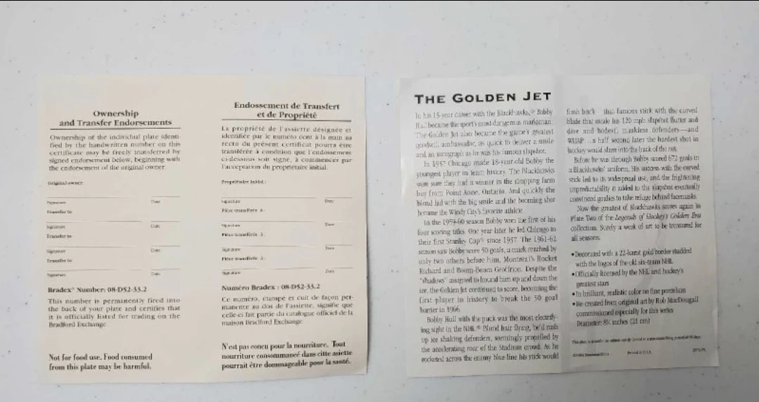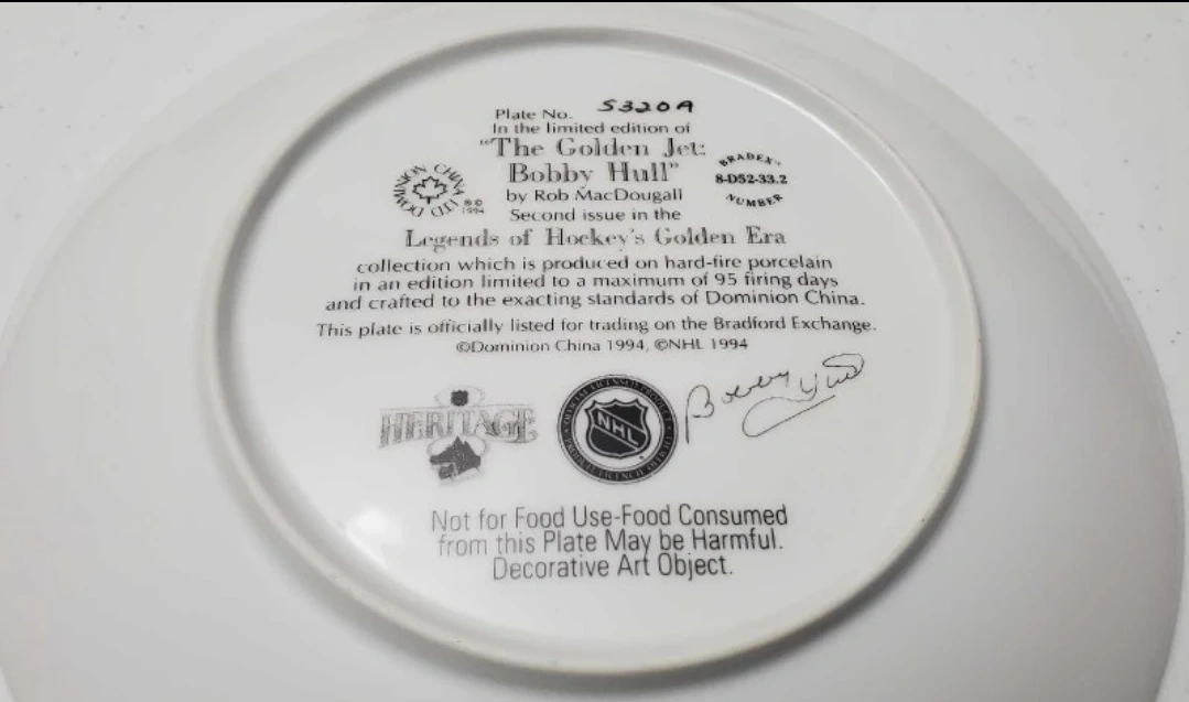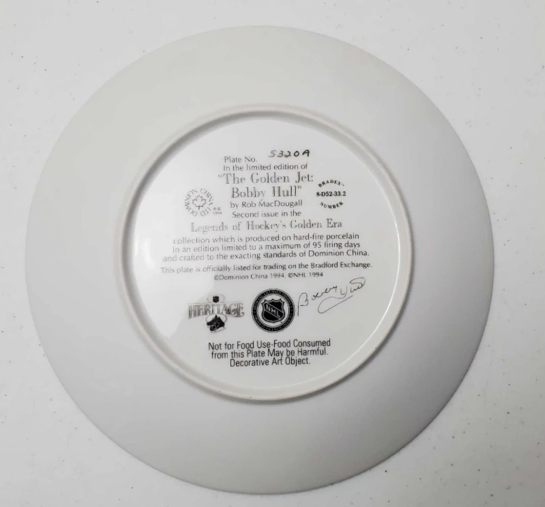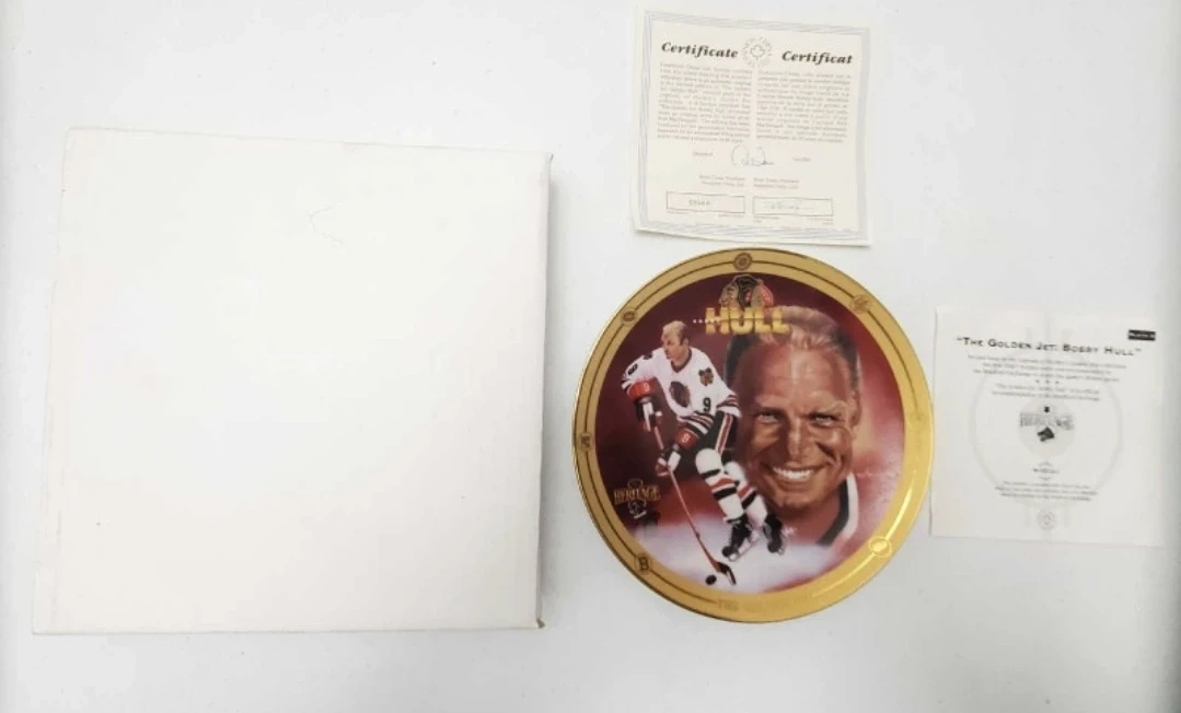 Here we have a 1994 Branford exchange collectors plate of chicago black hawks legendary hockey player Bobby Hull. No chips or cracks , comes with box and COA. please see pictures for exact condition.