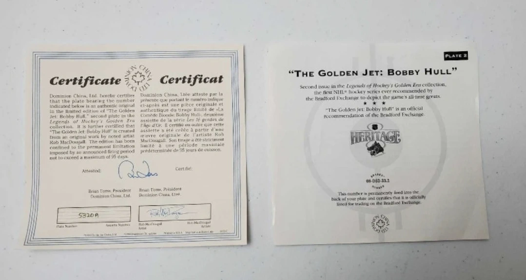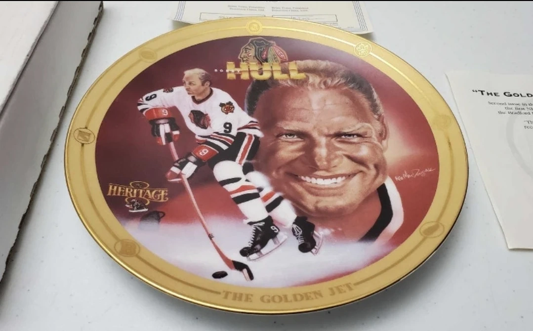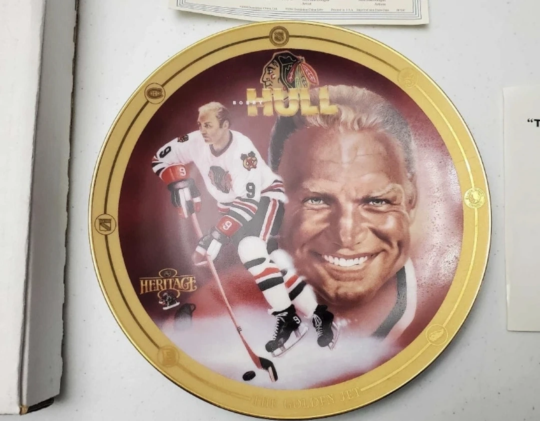 Here we have a 1994 Branford exchange collectors plate of chicago black hawks legendary hockey player Bobby Hull. No chips or cracks , comes with box and COA. please see pictures for exact condition.