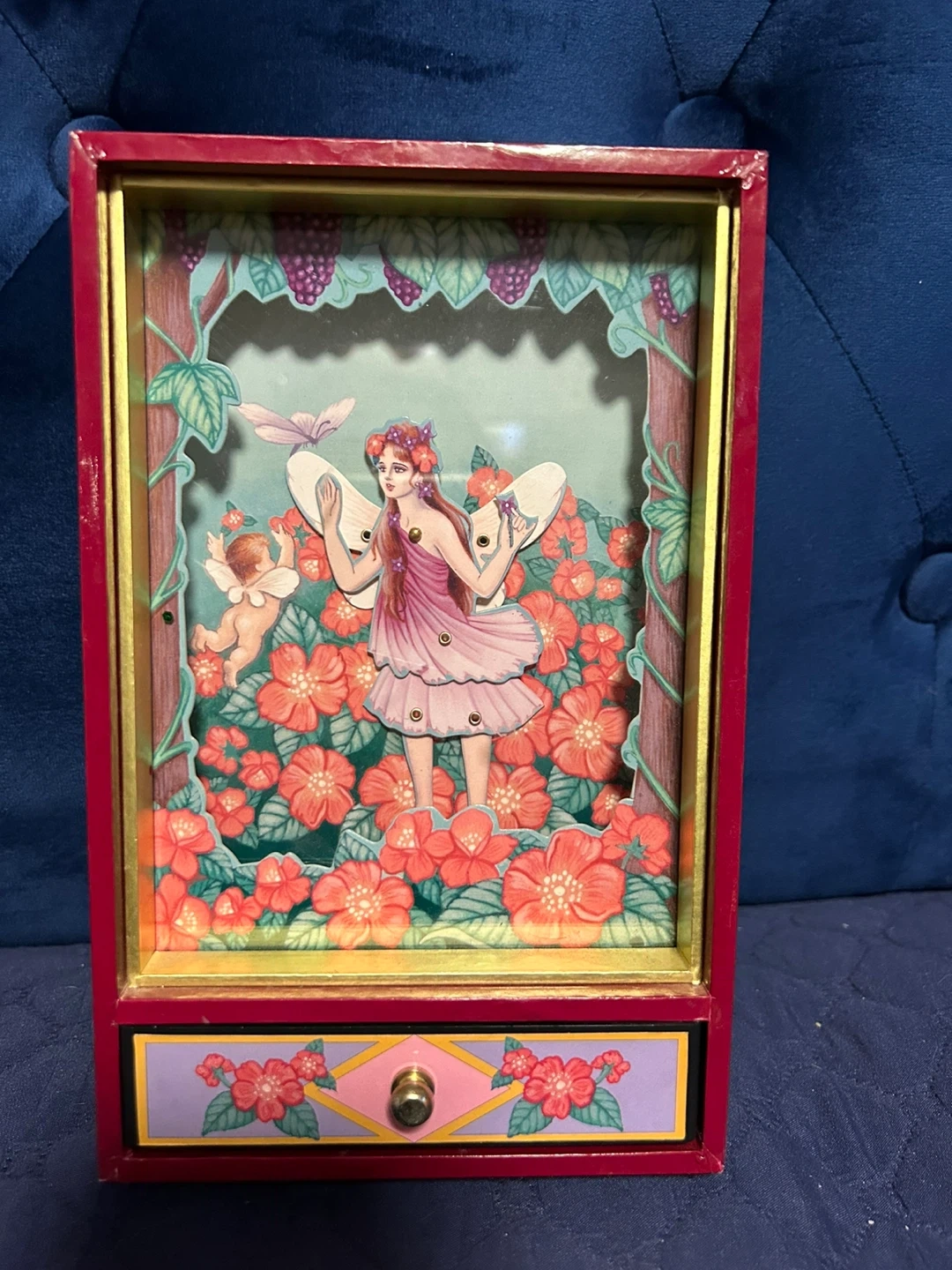 A whimsical diorama music box featuring a fairy surrounded by flowers and grapes. It has a small drawer at the bottom for storage. Made with decorative paper and wood. Perfect for adding a touch of magic to a room!