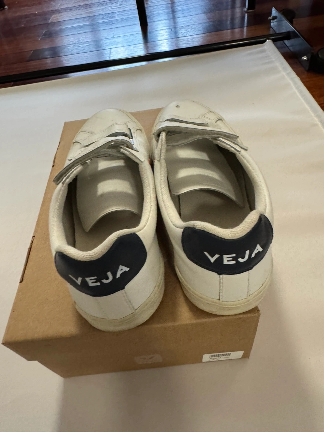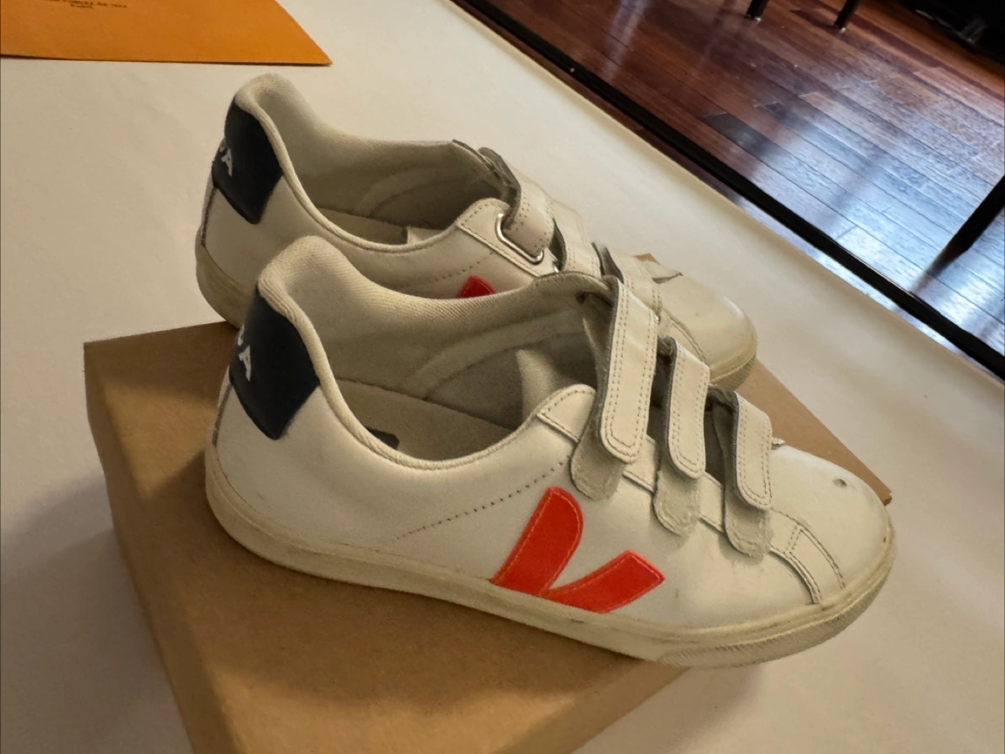 Selling a pair of Veja velcro sneakers! They are white with a red logo and a navy blue heel. They are in used condition, as seen in the photos, but still have lots of life left. Size US 7