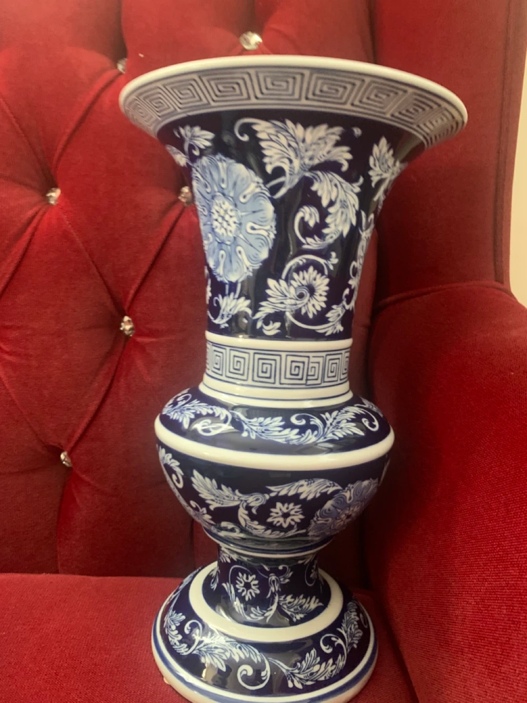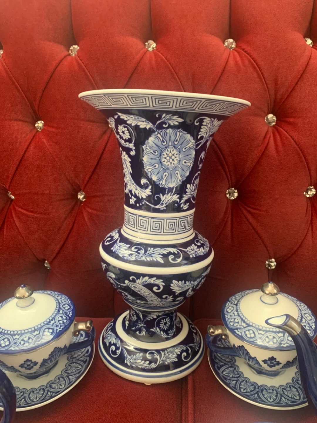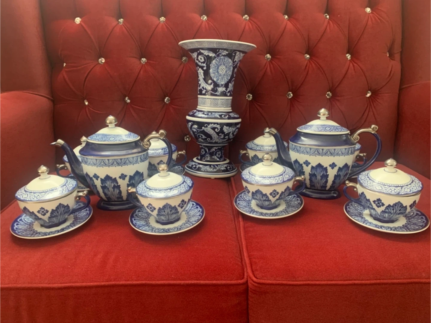 A vintage-style porcelain tea set featuring two teapots, six cups and saucers, and lids. Includes a matching decorative vase. Features a classic blue and white floral pattern.