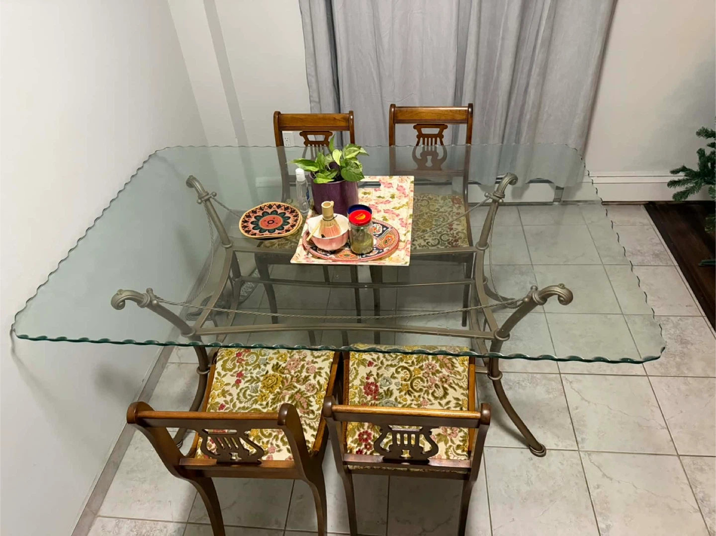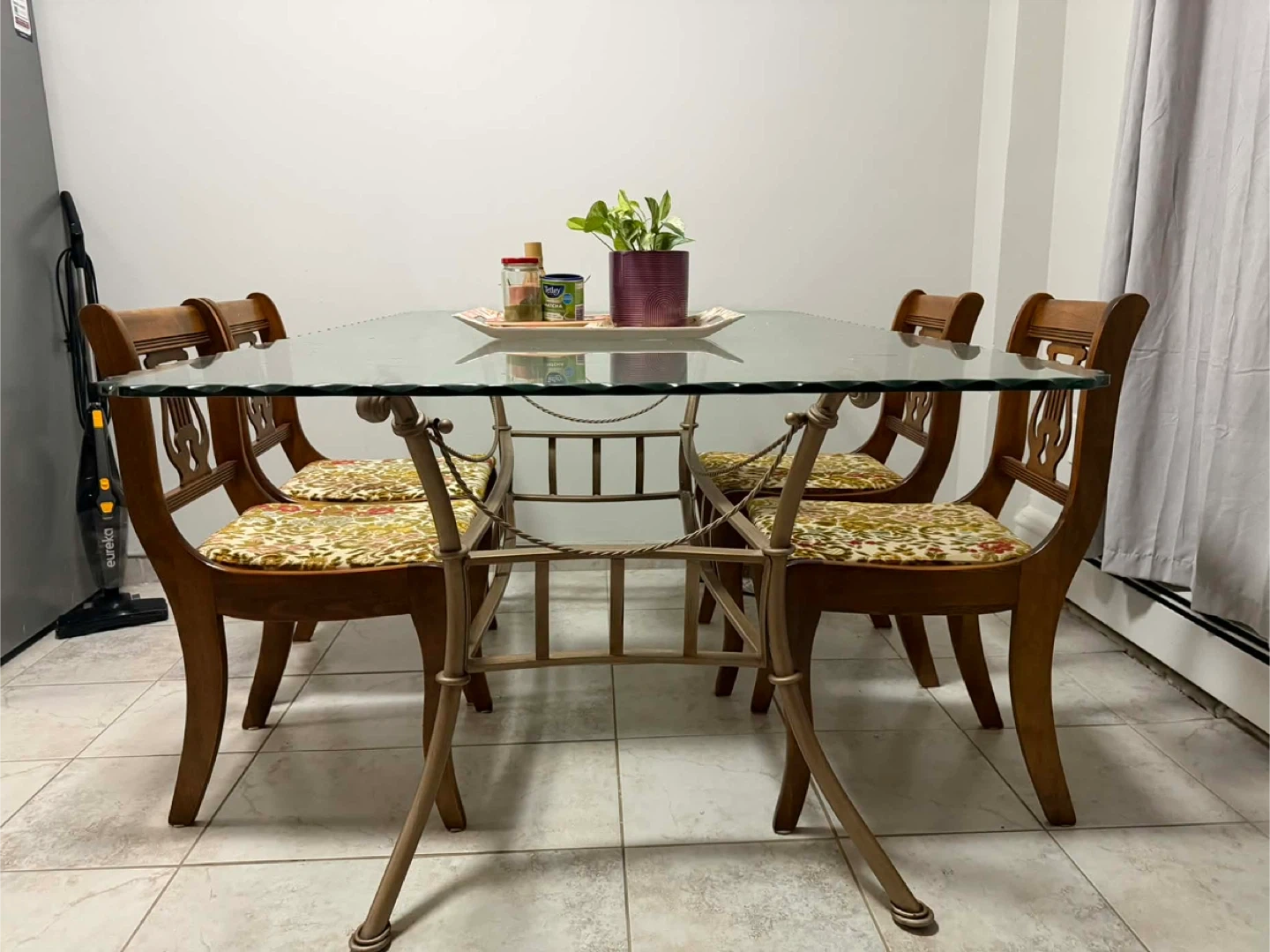 This dining set features a clear glass tabletop with a decorative metal base. It includes four wooden chairs with upholstered seats in a floral pattern. Perfect for smaller dining spaces or as an accent piece.