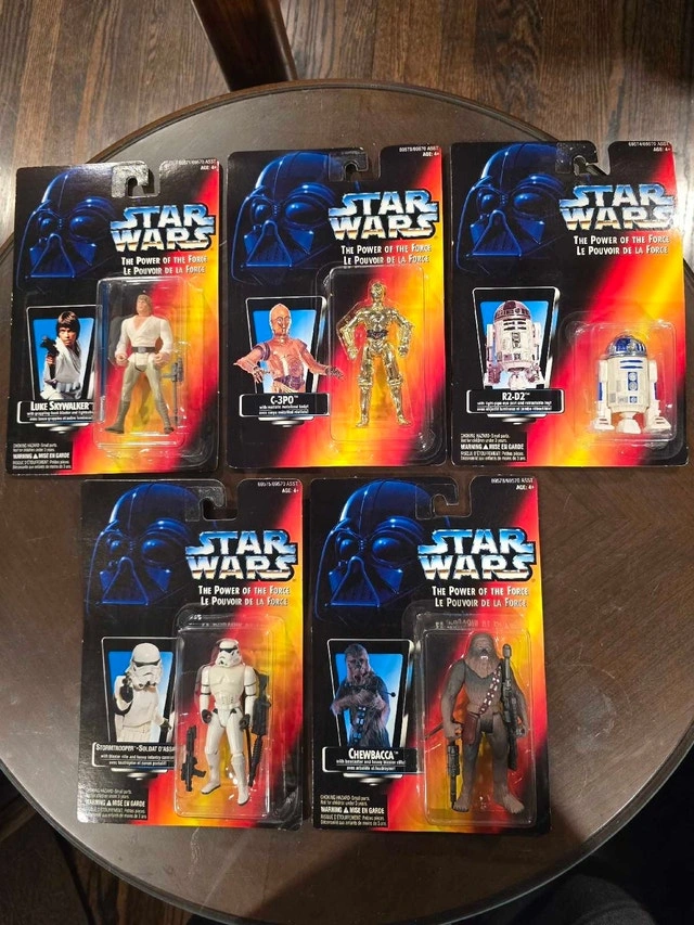 Offering a collection of Star Wars: The Power of the Force action figures from the 1990s, still sealed on their original cards. A great addition to any Star Wars collection. Please note that as these are vintage collectibles, the carding is not in mint condition. Available figures include: Luke Skywalker, Han Solo, C-3PO, R2-D2, Stormtrooper, and Chewbacca. Priced at $10 each, or $50 for the lot. If the ad is up, the item is available. Cash accepted.