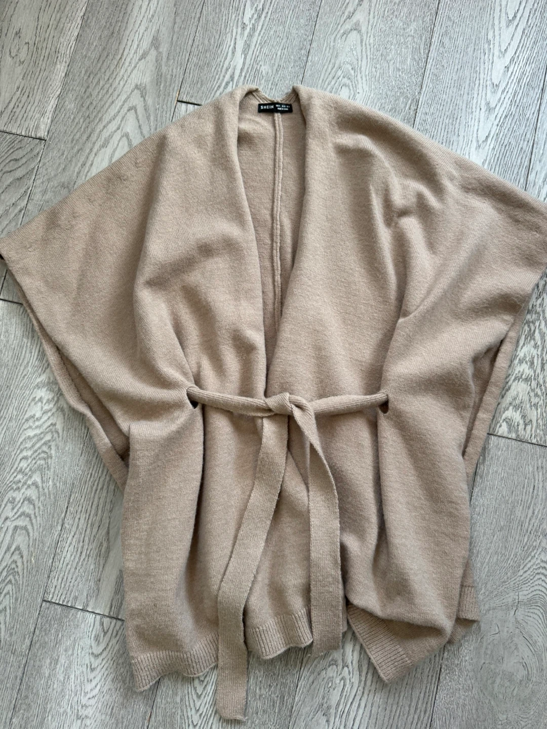 A cozy knit poncho wrap in a neutral beige colour. It's designed with an open front and includes a matching belt for a cinched look. This poncho offers a stylish layering option for cooler days.