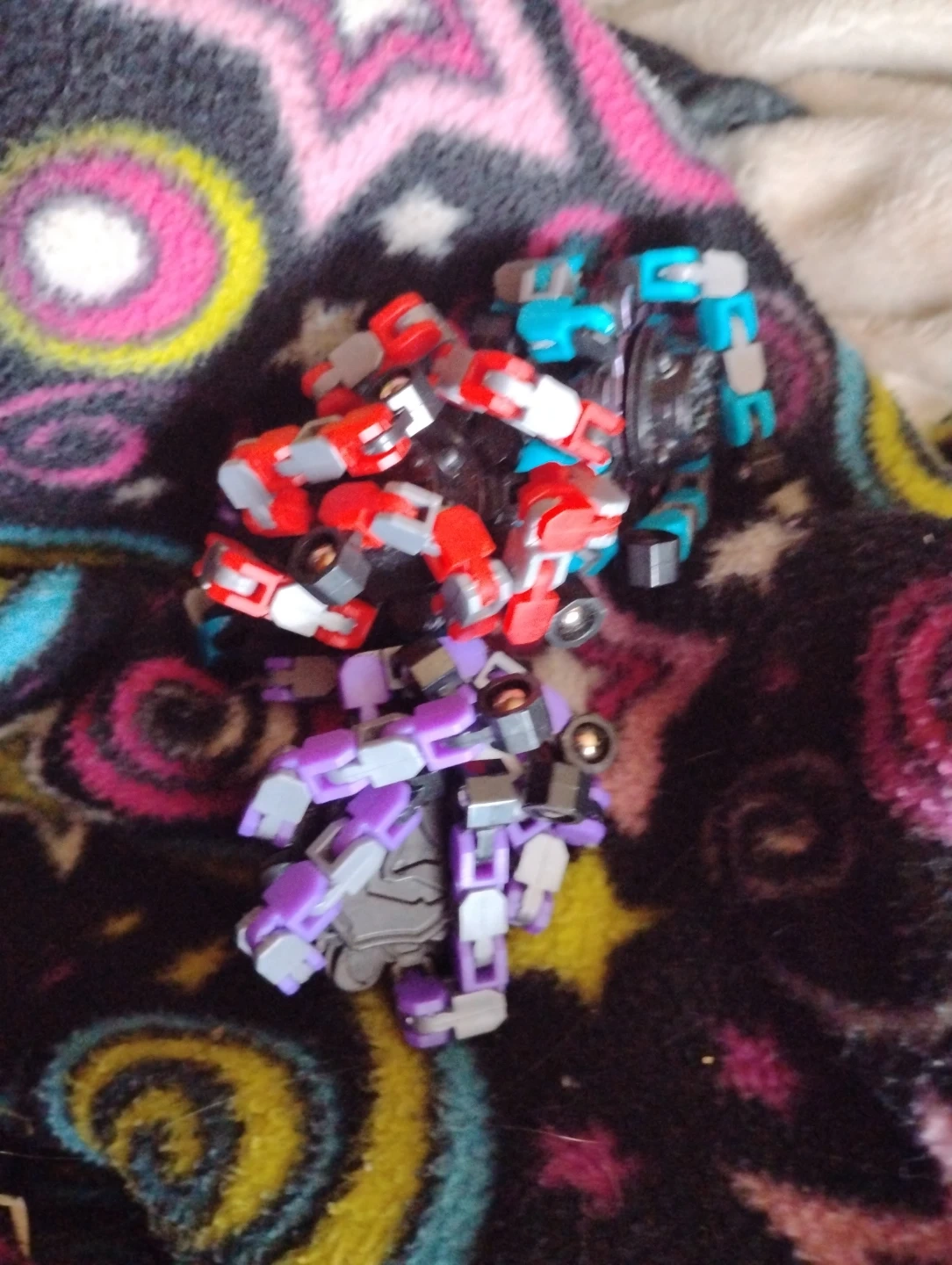 Bundle of three action figures, one red, one blue and one purple. These transforming robot toys are great for imaginative play. They're made of plastic.