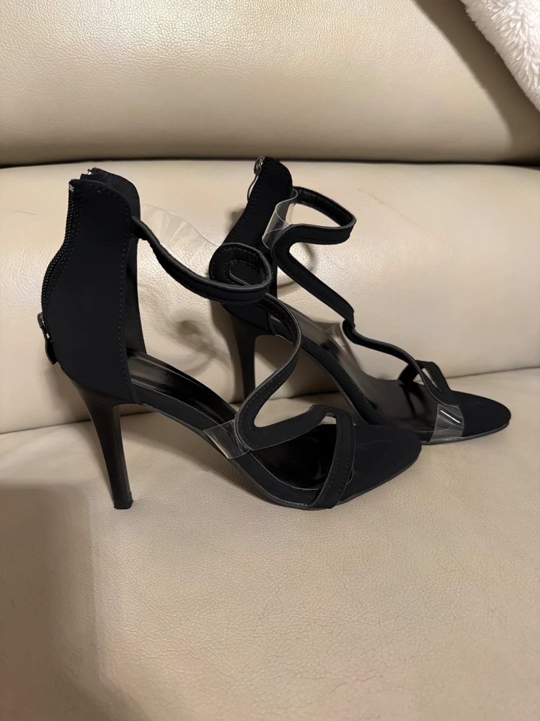 Selling a pair of black heels in size 6 They have a unique design with clear accents and a stiletto heel. These heels are perfect for a night out or a special occasion!