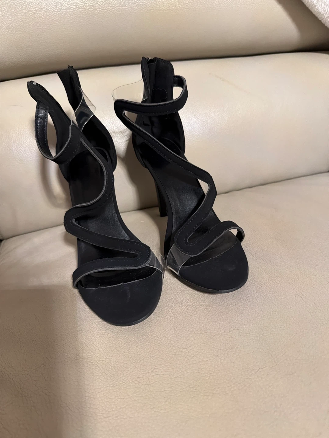 Selling a pair of black heels in size 6 They have a unique design with clear accents and a stiletto heel. These heels are perfect for a night out or a special occasion!