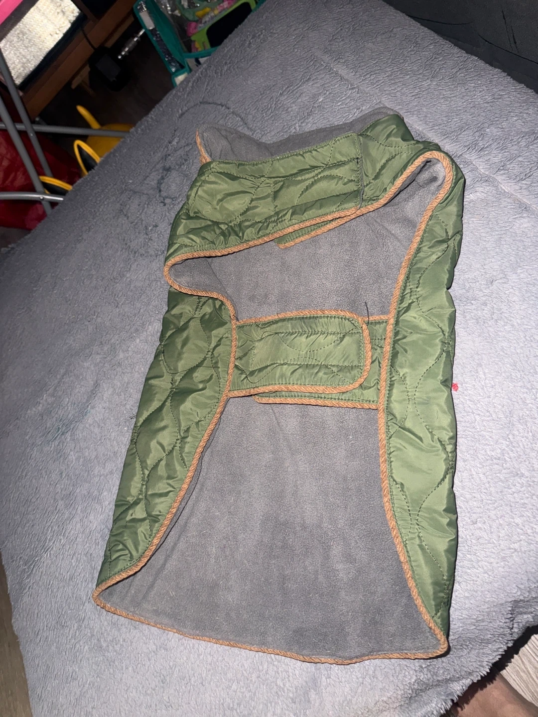 This green quilted dog jacket by Eddie Bauer is perfect for keeping your furry friend warm. It features a soft fleece lining and a corduroy collar for extra comfort. The jacket is easy to put on and secure with a strap.