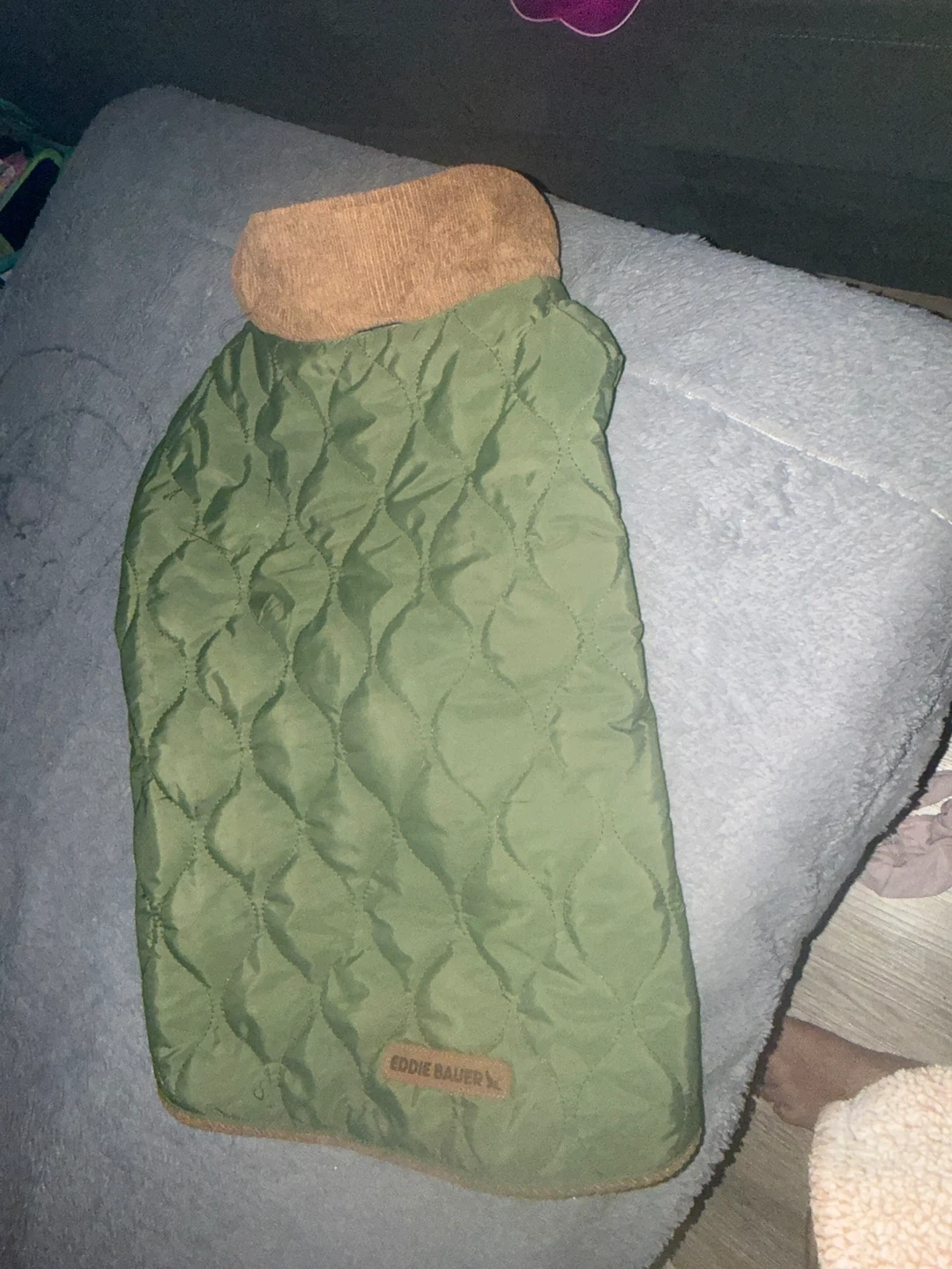 This green quilted dog jacket by Eddie Bauer is perfect for keeping your furry friend warm. It features a soft fleece lining and a corduroy collar for extra comfort. The jacket is easy to put on and secure with a strap.