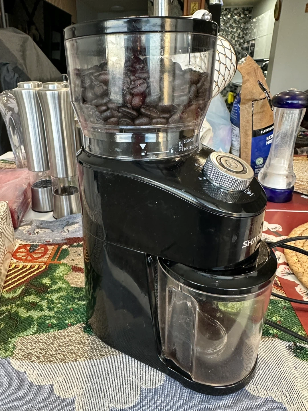 SHARDOR electric coffee grinder with a hopper full of beans. It has adjustable grind settings from coarse to medium. The hopper and collection bin are clear plastic.