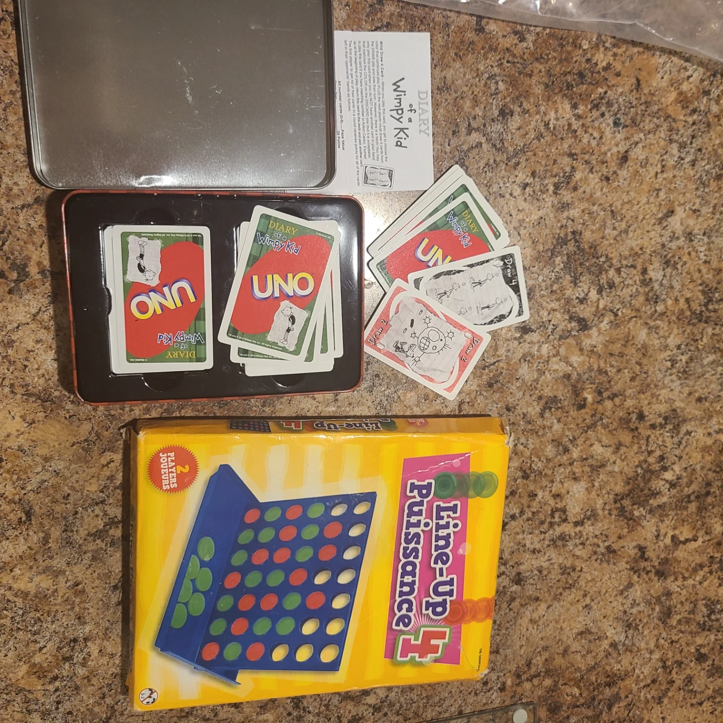 This bundle includes the Diary of a Wimpy Kid UNO card game, featuring custom cards and a tin for storage. Also included is the Line-Up 4 board game, a classic strategy game for two players. Both games appear to be complete and ready for fun!