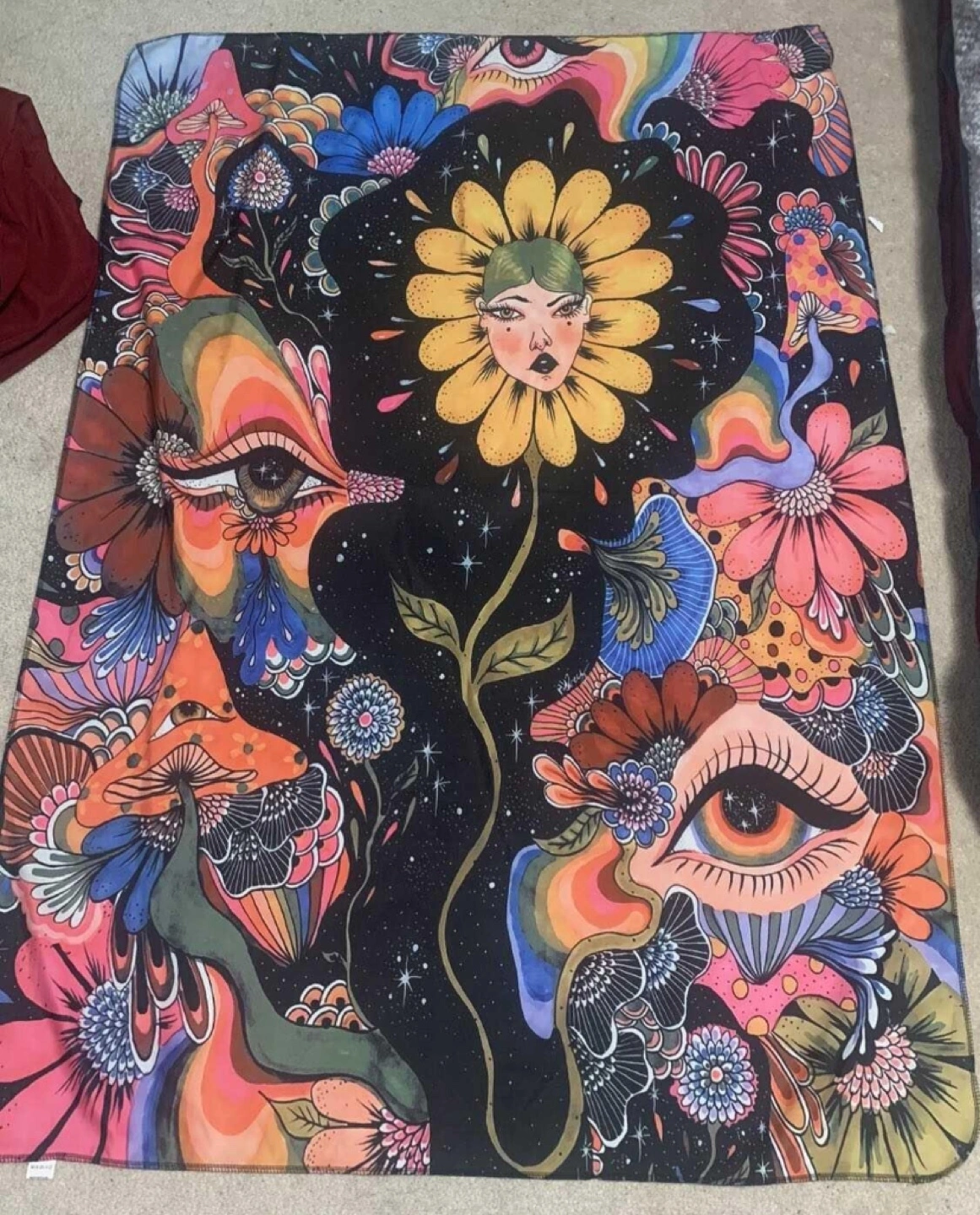 Vibrant tapestry featuring a trippy floral design. Features various flowers, eyes, and a girl’s face within a sunflower. Perfect for adding a bohemian touch to your space. Bigger than your average tapestry asking 20 or best offer:)