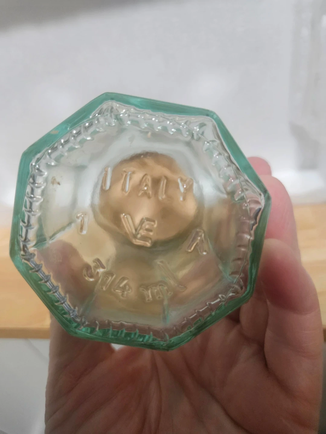 This is a glass jar with a cork lid. It's octagonal shaped and made of clear glass. The bottom shows it's made in Italy and has a capacity of 314 ml. Signed VE A (Viteria Etrusca)