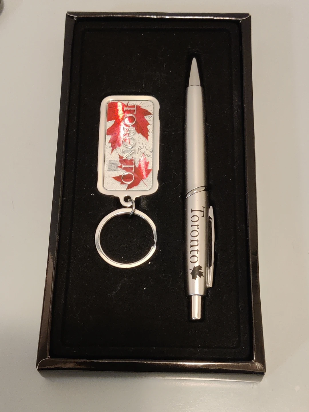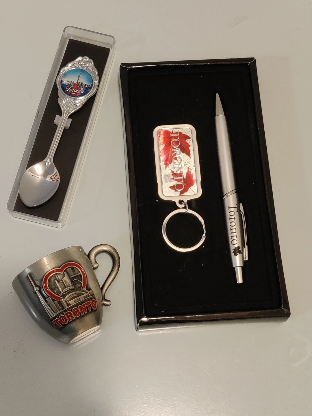 This set includes a Toronto-themed pen and keychain in a box, a souvenir spoon with a CN Tower design, and a small mug with a Toronto skyline. Perfect for collectors of Canadian memorabilia!