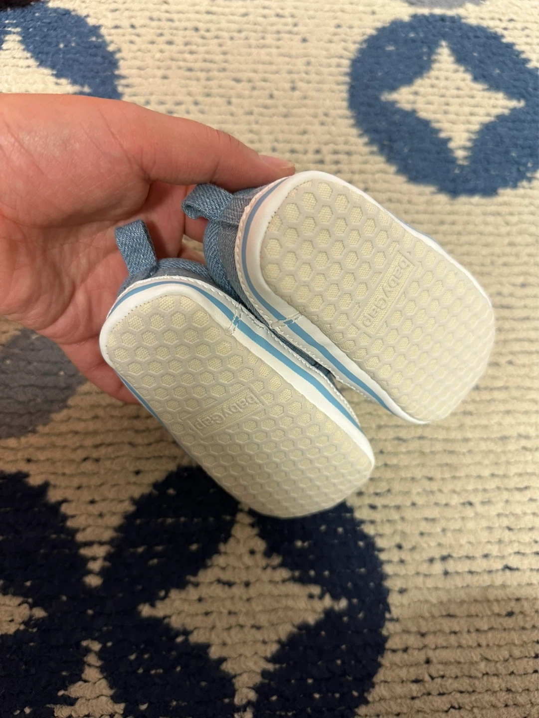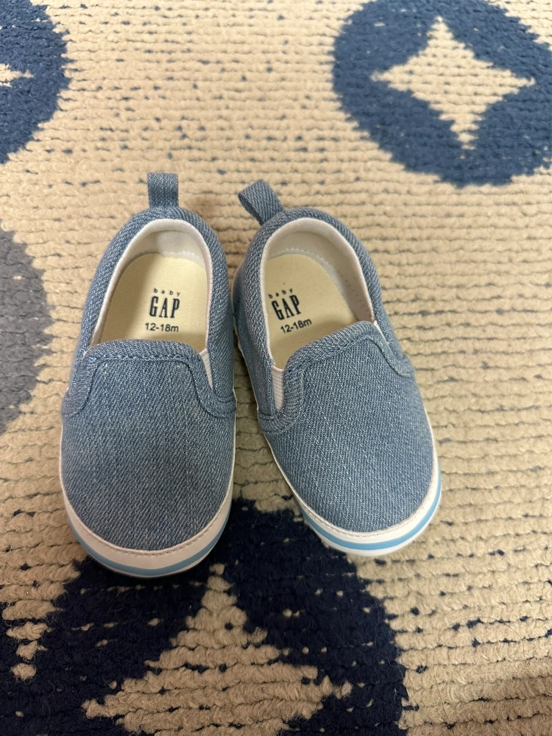 Cute baby blue denim slip-on sneakers from Baby Gap. Size is 12-18 months or size 5 in general for babies. These are perfect for little ones learni