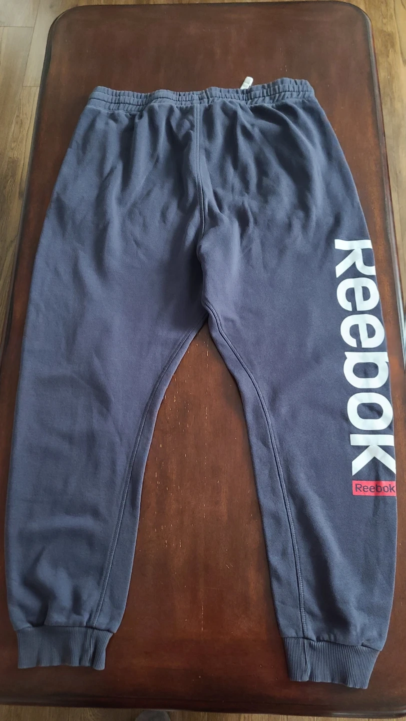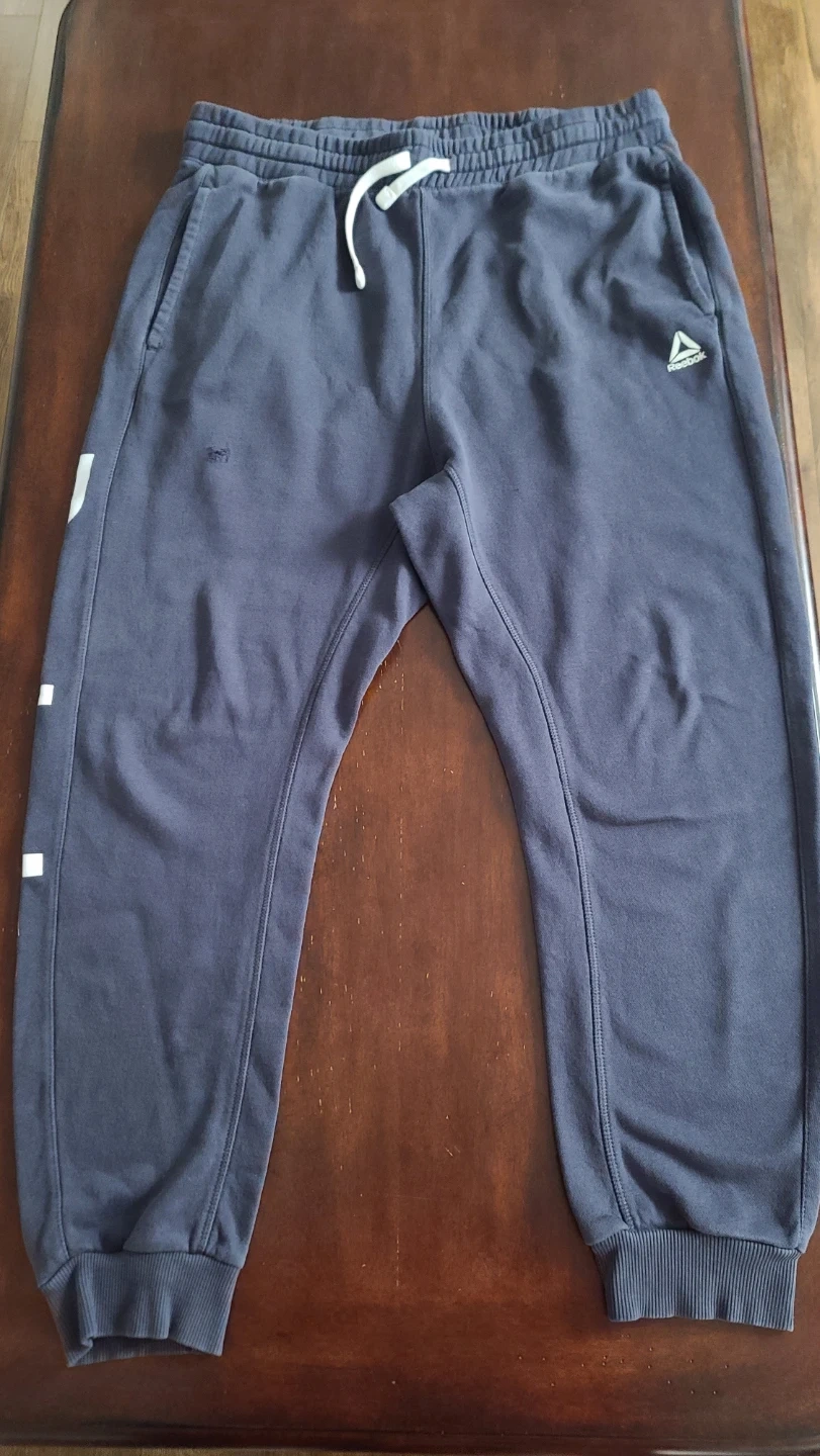 Selling a pair of dark blue Reebok sweatpants in a comfortable slim fit with tapered legs. These are great for everyday wear, featuring front pockets and an adjustable drawstring on the waistband.