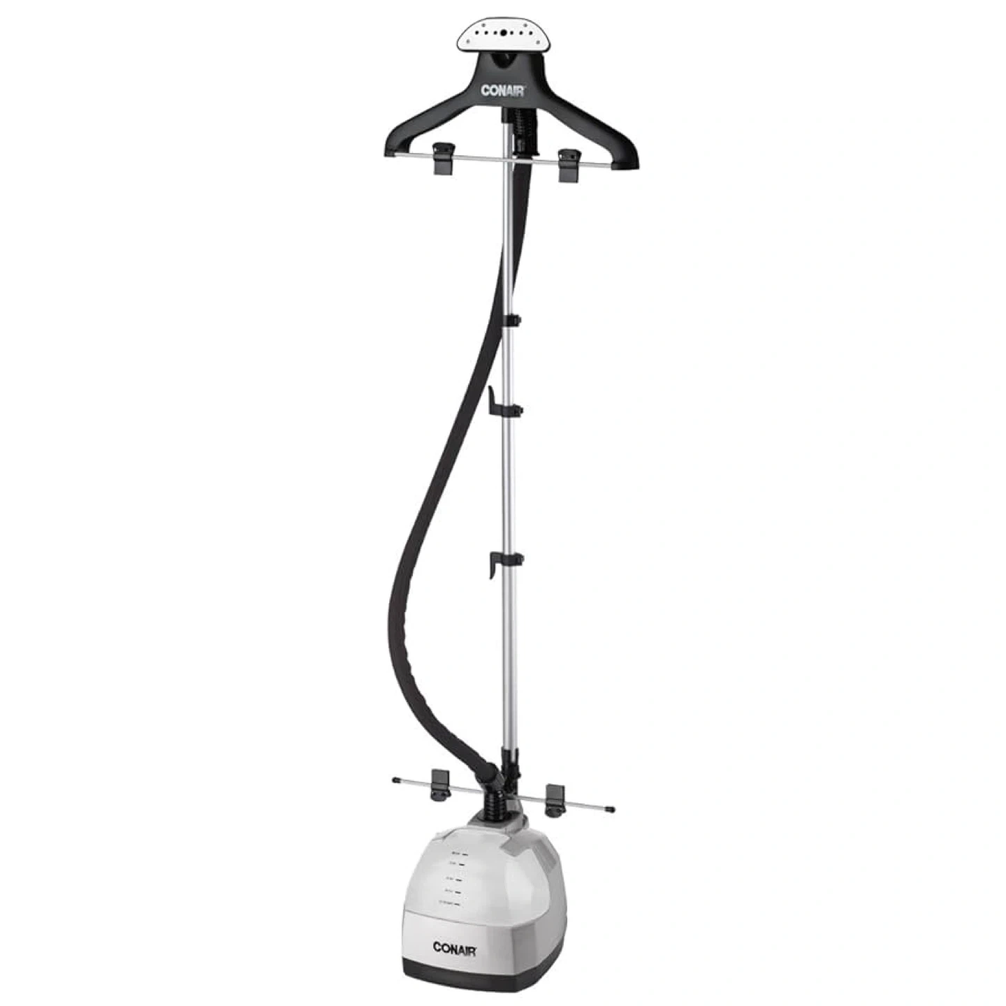 Features a telescoping pole for height adjustment and T nozzle with 5 foot cool touch insulated hose, 360 degree rotating hanger with clips for steaming pants, and easy roll casters so you can freshen all over the house.
