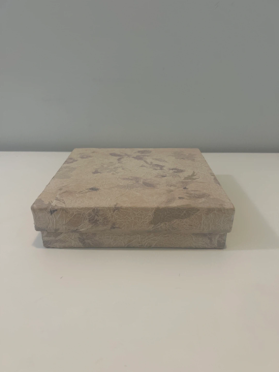 A decorative box with a lid and four interior compartments. The box has a textured paper finish with a subtle floral pattern. It's suitable for storing small items or as a gift box.