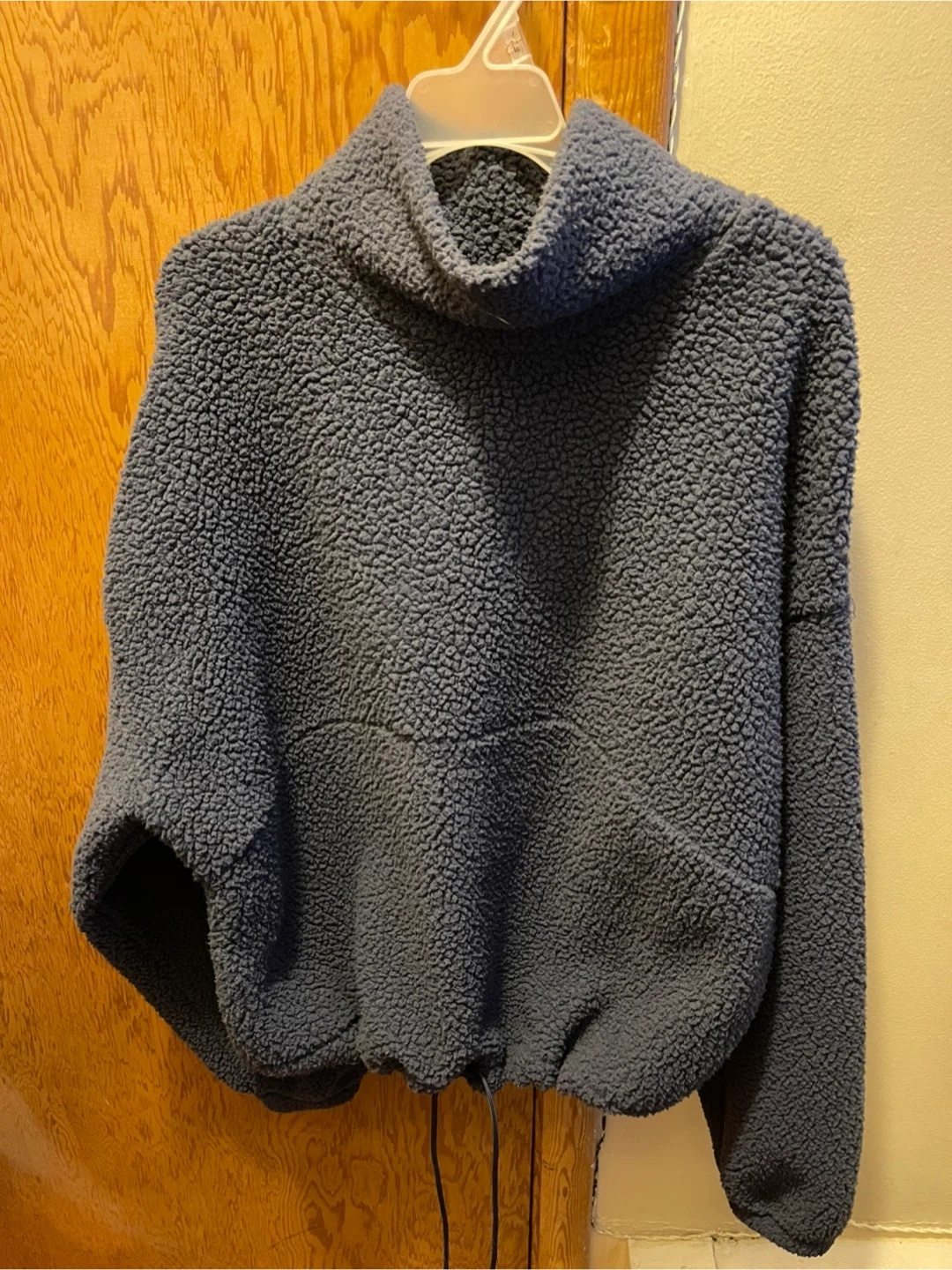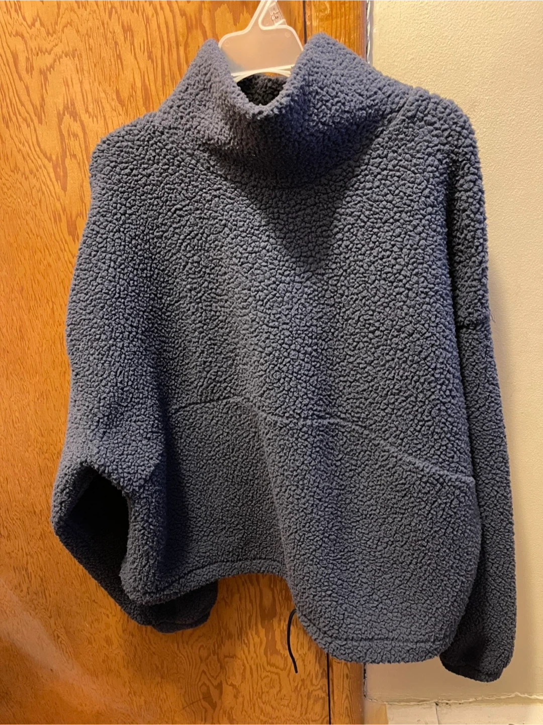 Cozy up in this navy blue fleece pullover. It's a size M Tall oversize with a mock neck design. The material is soft and perfect for cooler weather!