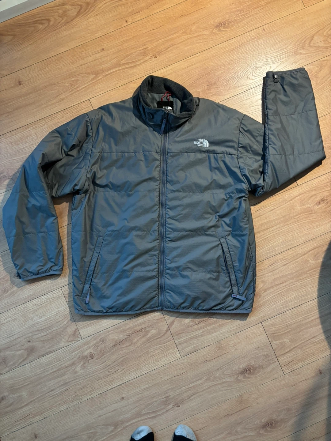 This is a grey jacket from The North Face. It's a warm and lightweight outerwear option. This jacket is suitable for casual wear during cooler weather.