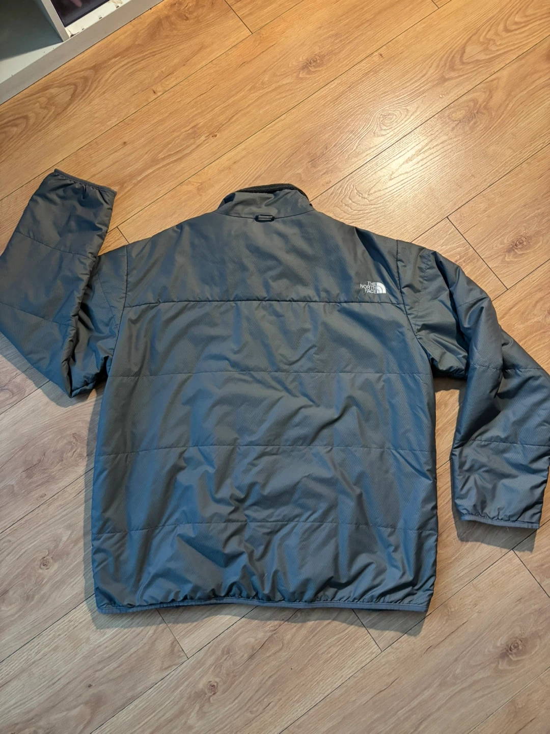 This is a grey jacket from The North Face. It's a warm and lightweight outerwear option. This jacket is suitable for casual wear during cooler weather.