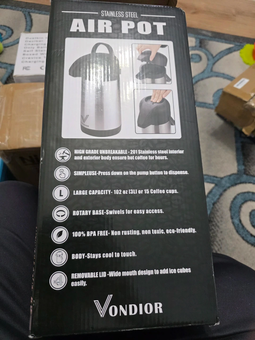 This Vondior stainless steel air pot holds 102 oz or 3L, perfect for keeping drinks hot or cold for hours. It features a simple press-down pump and a removable lid for easy access. Includes a cleaning brush.