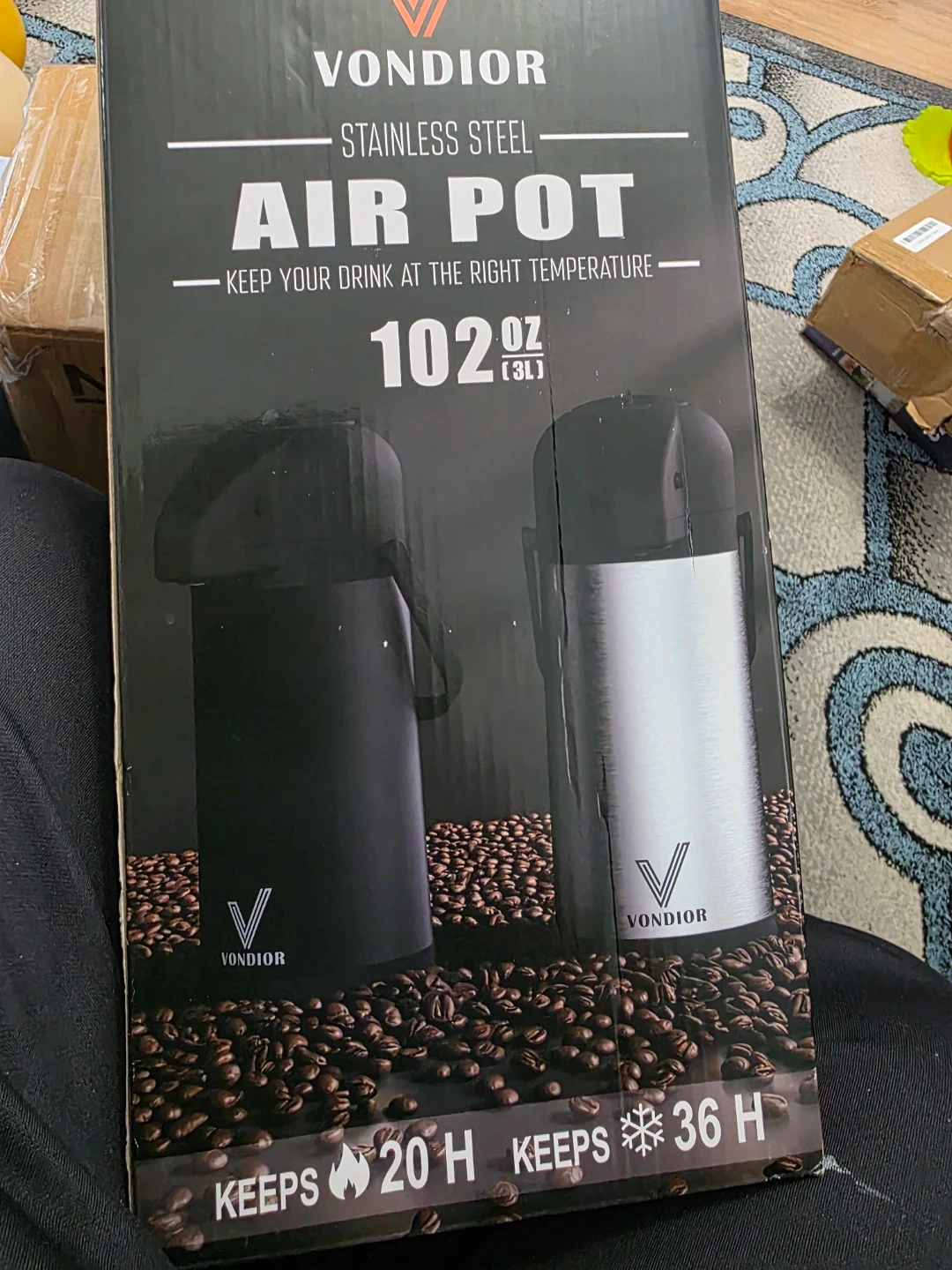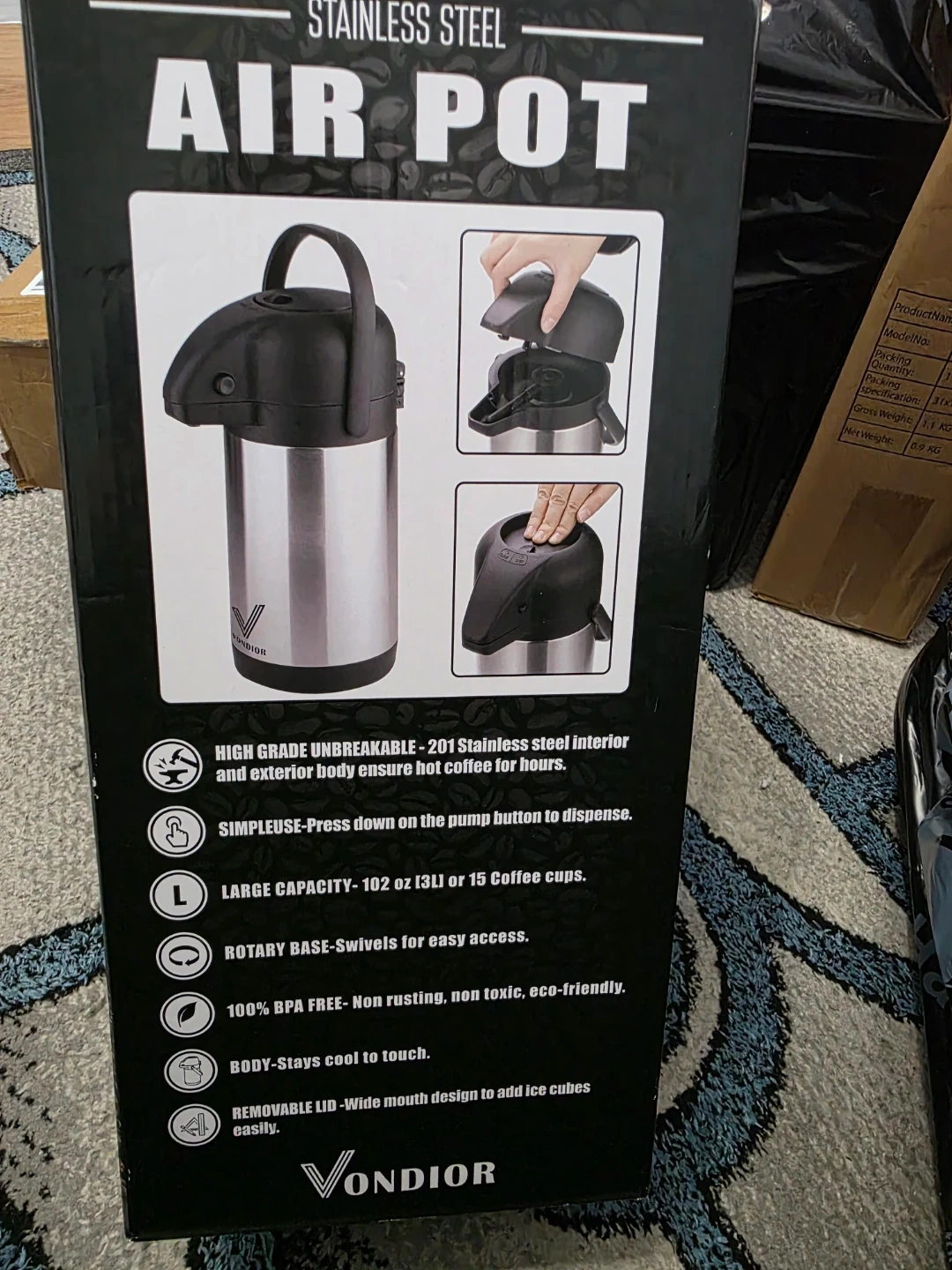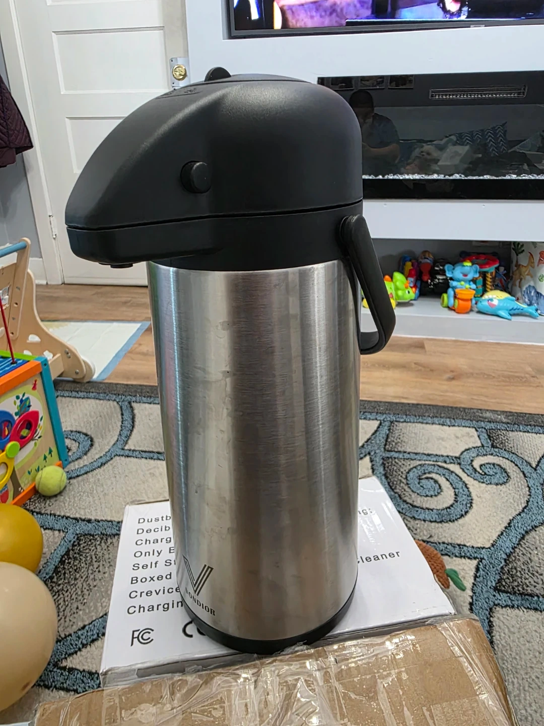 This Vondior stainless steel air pot holds 102 oz or 3L, perfect for keeping drinks hot or cold for hours. It features a simple press-down pump and a removable lid for easy access. Includes a cleaning brush.