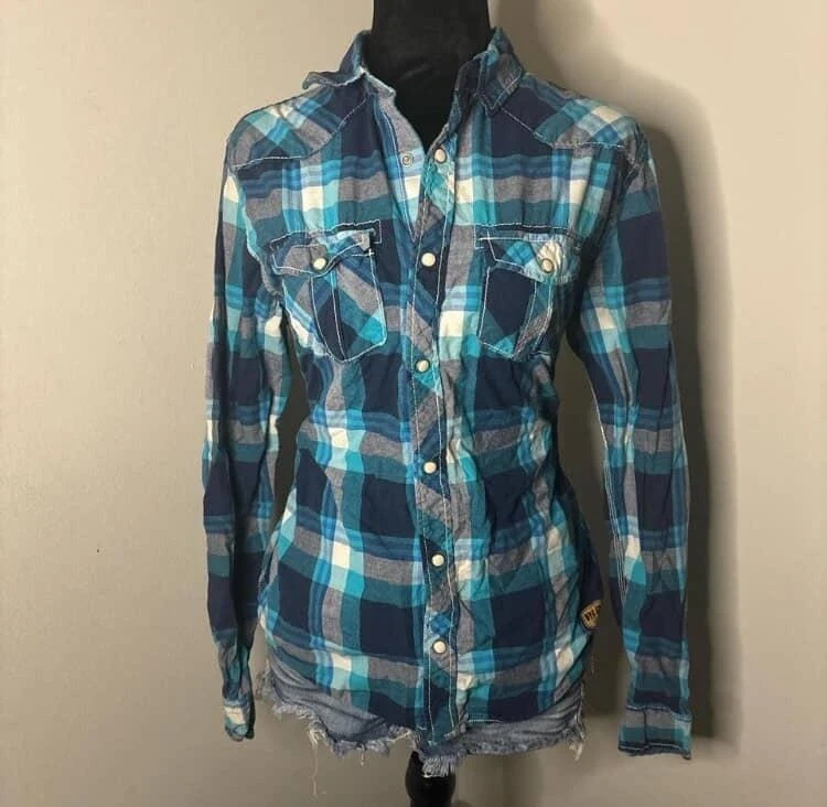 Aeropostale blue plaid long sleeve button up shirt. This classic western-style shirt features white contrast stitching and two chest pockets. It's made from comfortable fabric, perfect for casual wear.