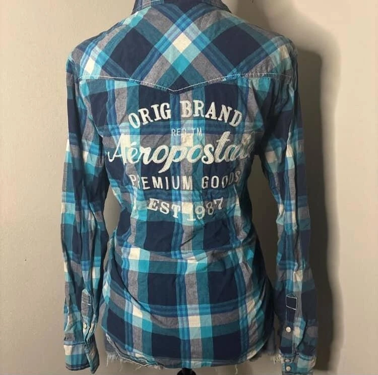 Aeropostale blue plaid long sleeve button up shirt. This classic western-style shirt features white contrast stitching and two chest pockets. It's made from comfortable fabric, perfect for casual wear.