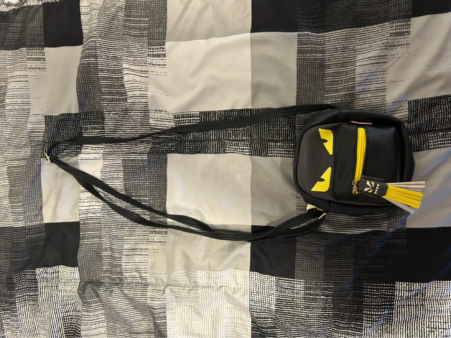 This black mini bag features a fun monster eye design with yellow accents. It has a zippered closure and a cute tassel detail. Small and stylish, it's great for carrying essentials on the go.