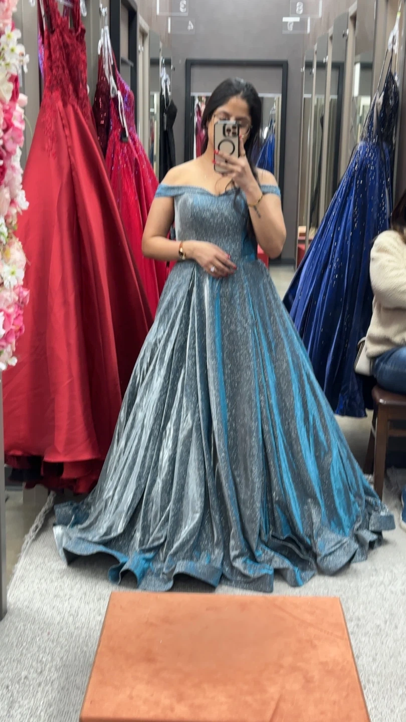 5Never worn! Beautiful off-the-shoulder gown with a sparkly blue fabric! Perfect for prom or a special event. Bought it from crossiron. Retails for 350$