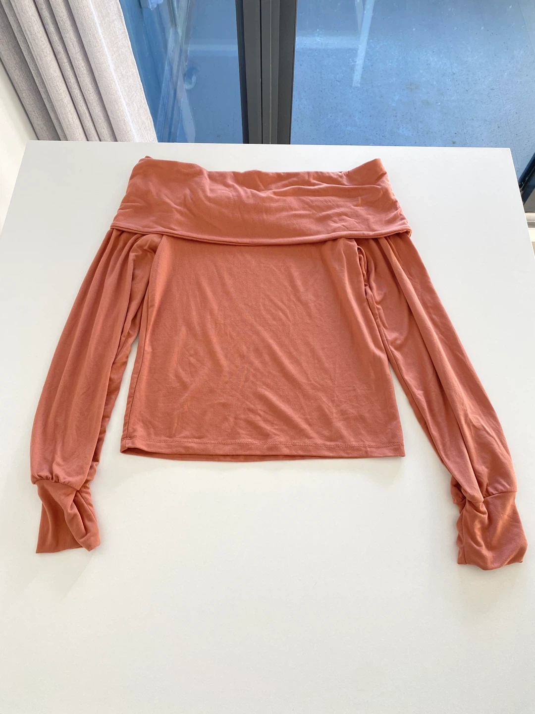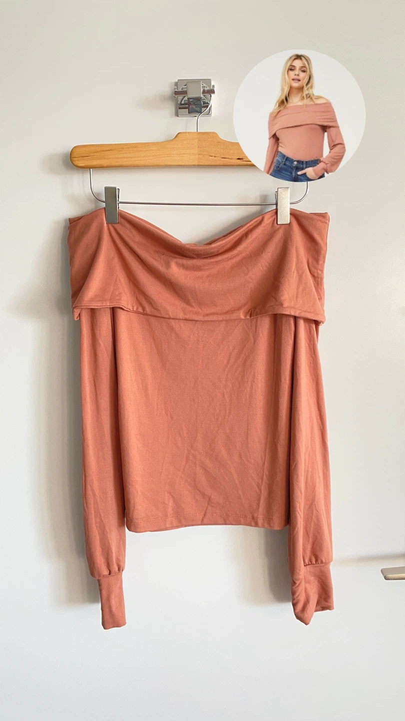 218A stylish off-the-shoulder long sleeve top in a lovely dusty coral colour! Fabric is soft like butter! It's perfect for dressing up or down and would be a great addition to your wardrobe. It's in great condition and ready for a new home Size small ❤️ Check out my other listings for great deals!