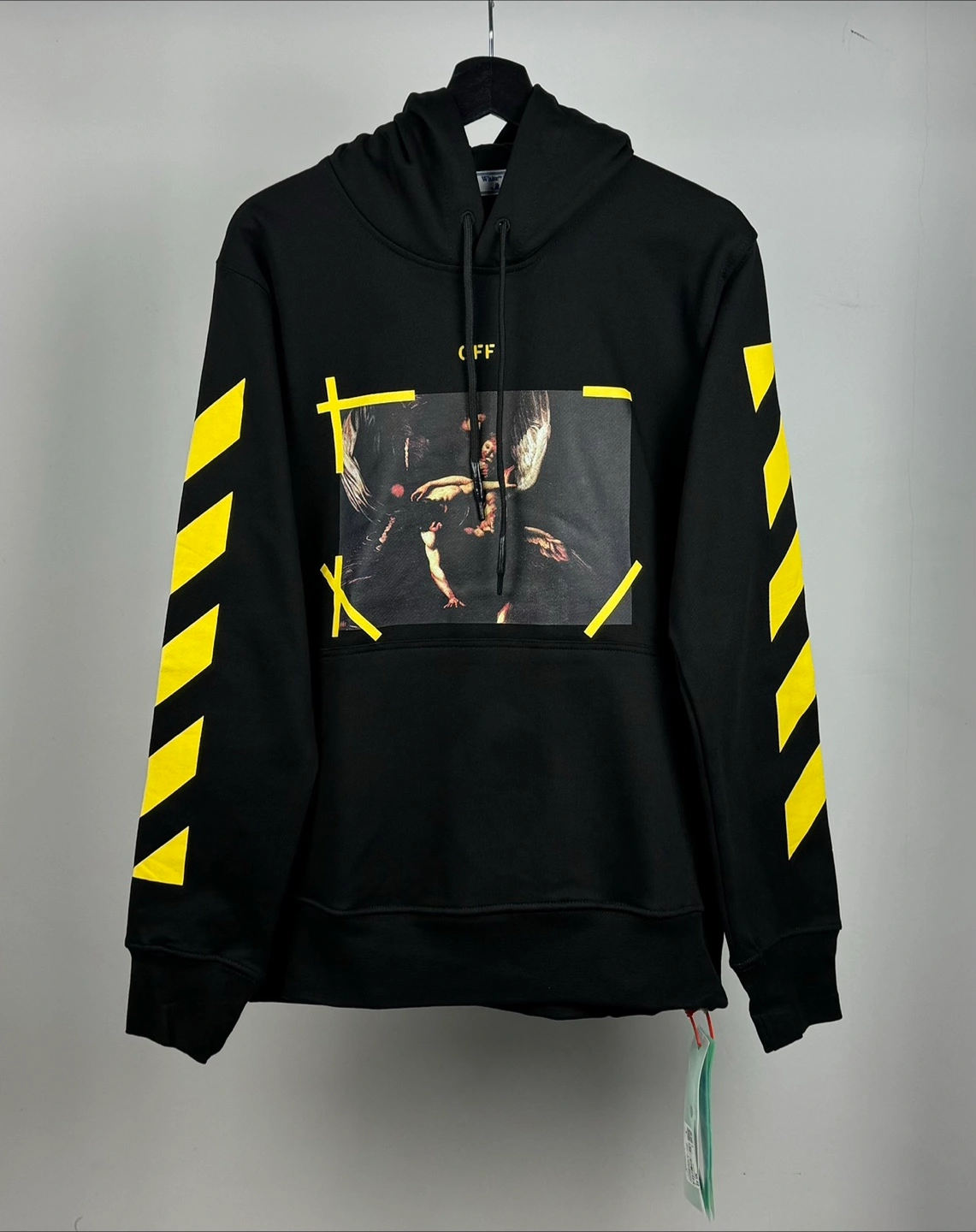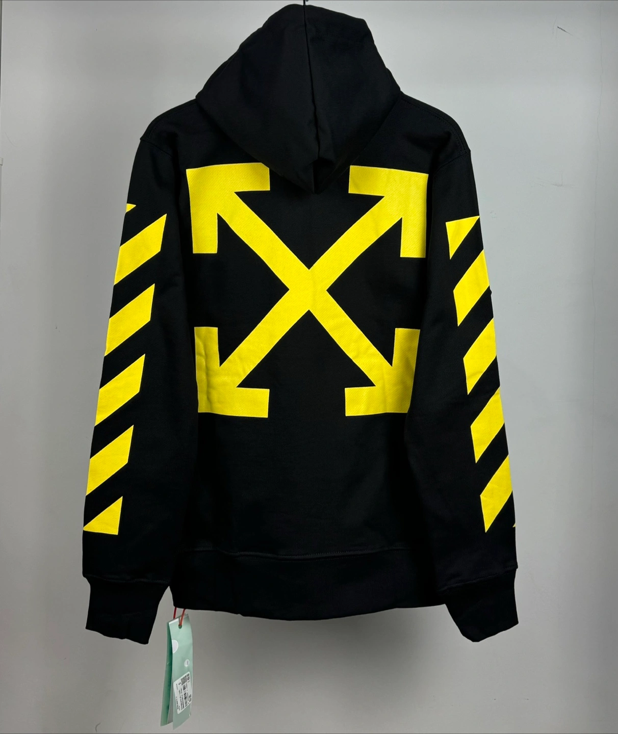 Selling a stylish Off-White hoodie in black with the iconic arrows design on the back and stripes on the sleeves. It's in great condition and ready for a new home! The hoodie features a unique graphic on the front, adding to its distinctive look