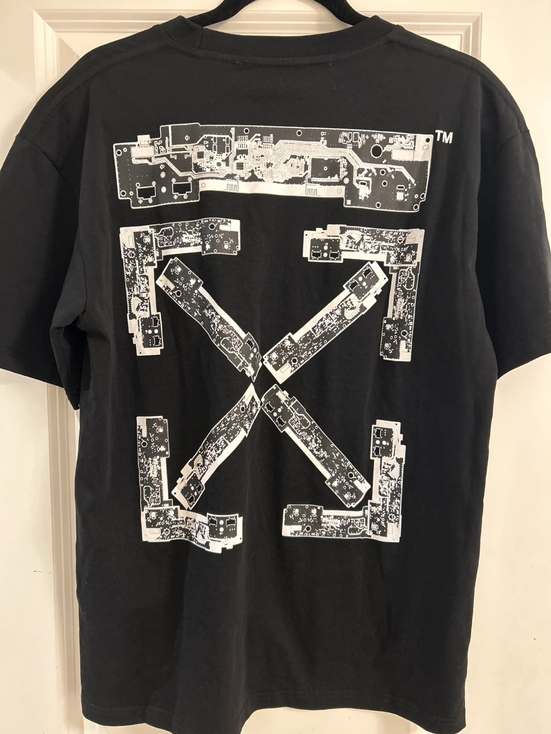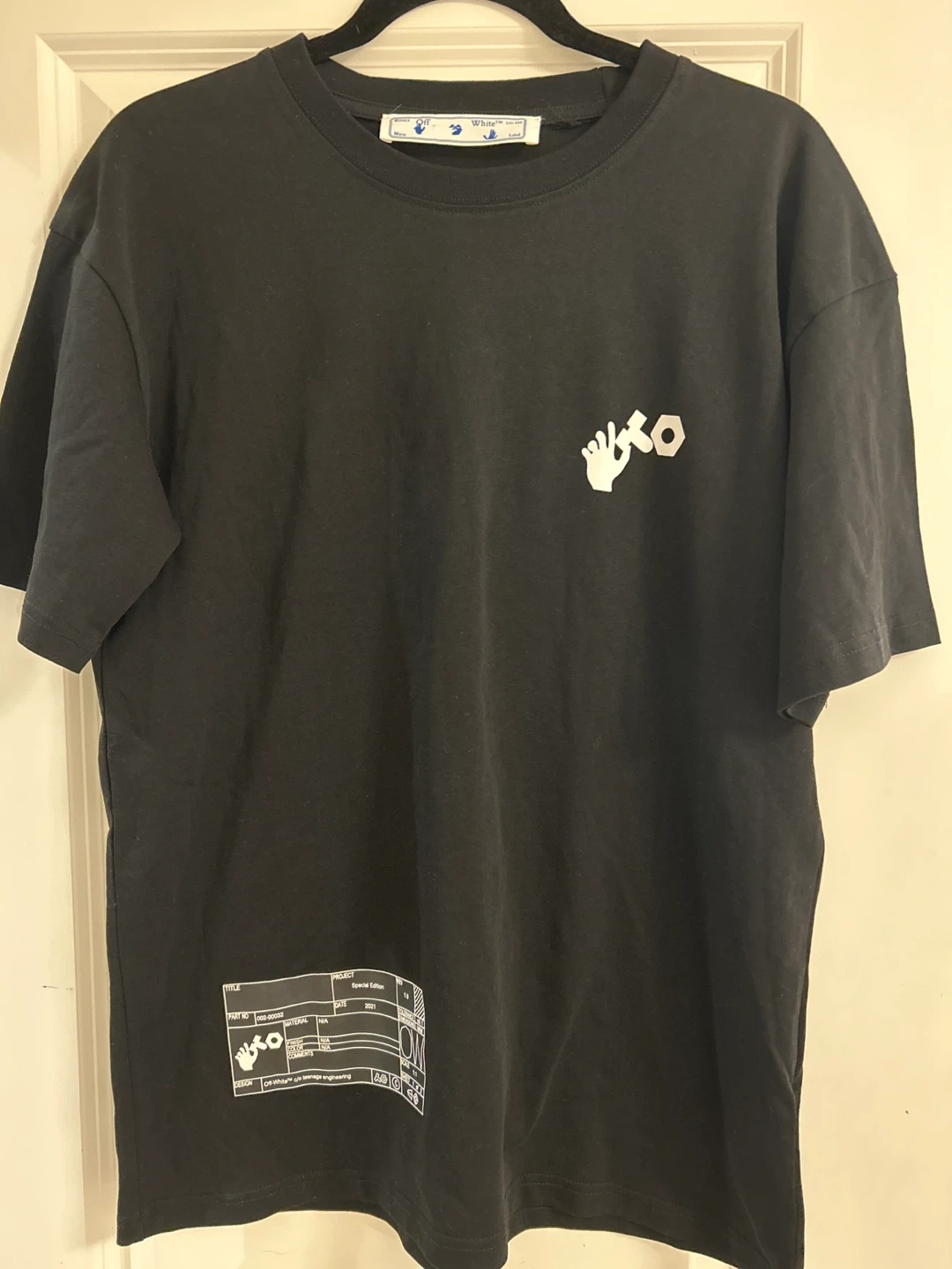 246Selling a black Off-White t-shirt in size small. The shirt features the iconic Off-White logo and design on the back. It's made of 100% cotton. Great for casual wear!