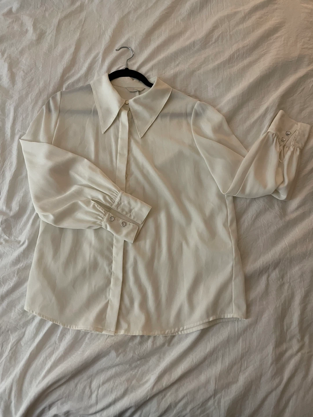 65Here's a stylish off-white button-up blouse! It would be a great addition to any wardrobe. It's in excellent condition and ready for a new home! Chest size 88cm! Large size