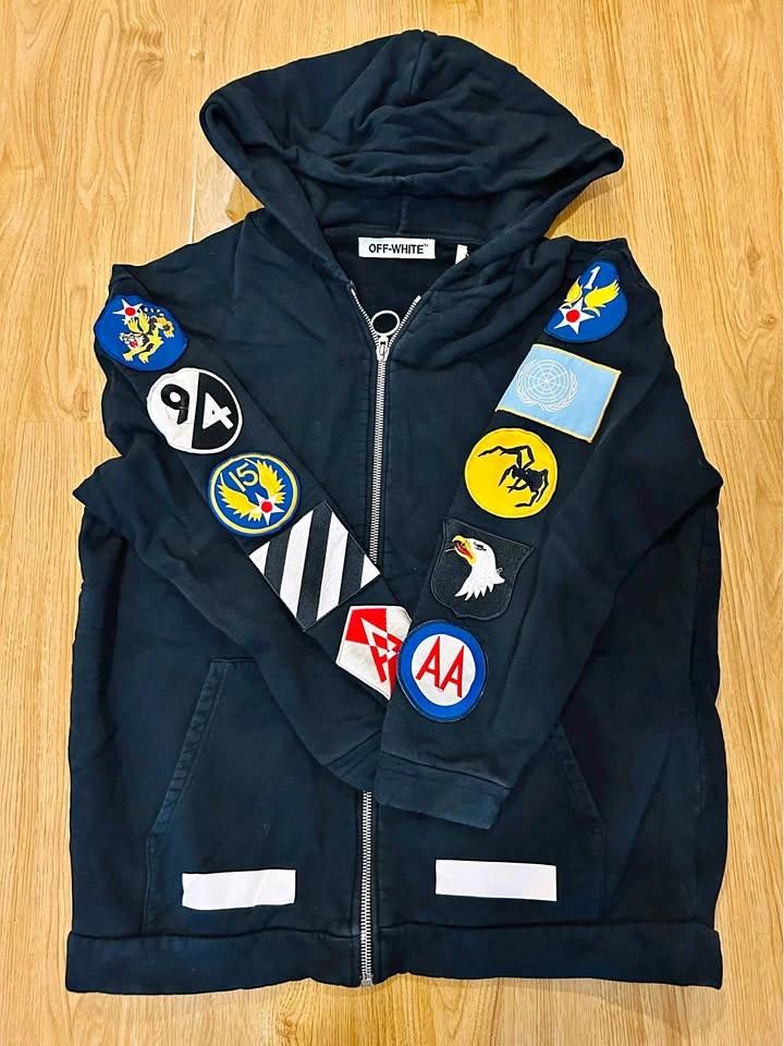 10Off-White Men’s Hoodie Size:M Zip-up style with unique military patch design. Great condition, barely worn. Comfortable, stylish, and easy to match with any outfit.