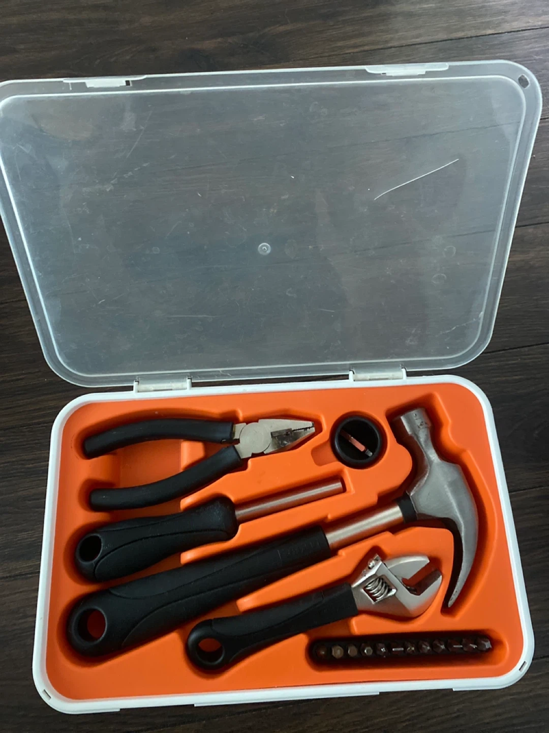 This IKEA FIXA tool set includes a hammer, pliers, adjustable wrench, and screwdriver with bit set. It's a handy kit for quick fixes around the house. Stored in a convenient plastic case.