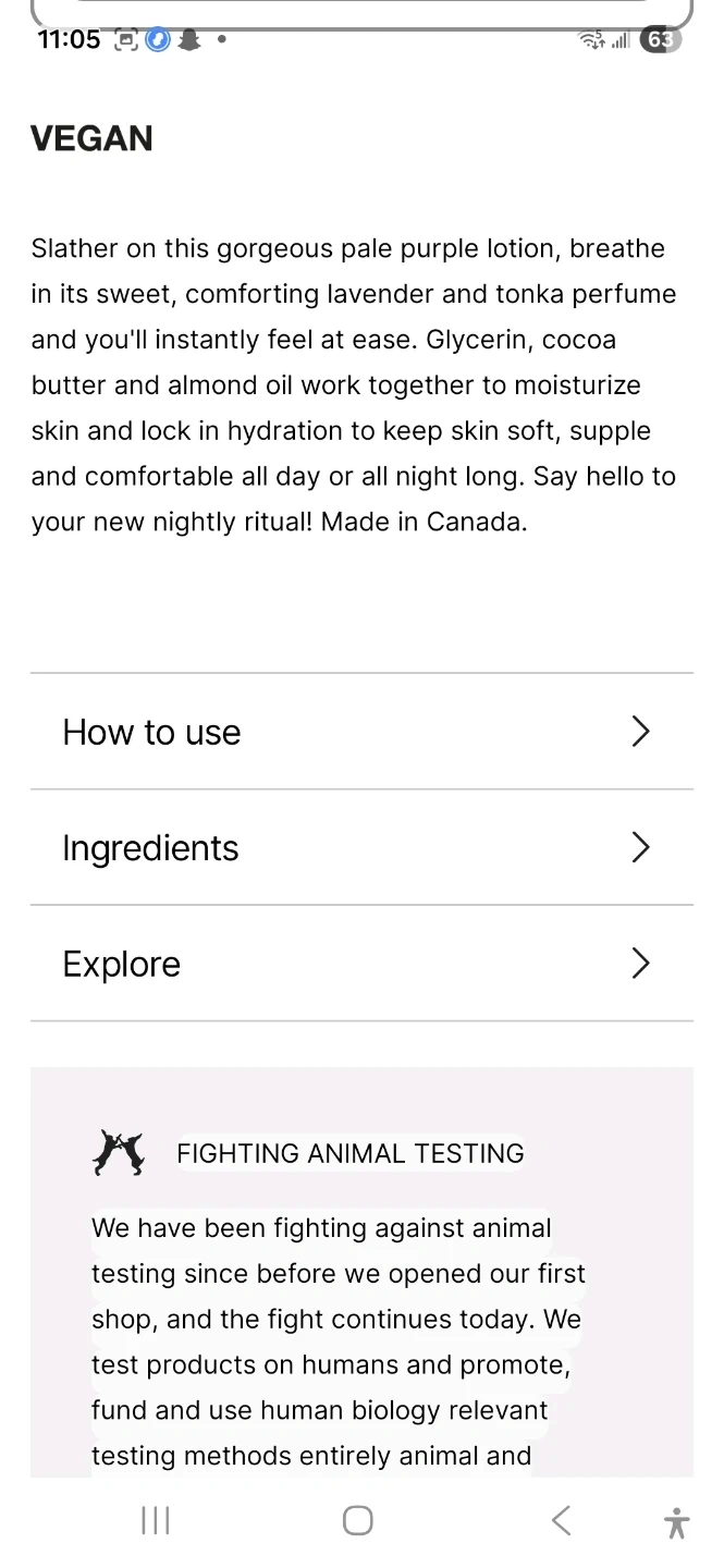 Slather on this gorgeous pale purple lotion with a comforting lavender and tonka perfume. Glycerin, cocoa butter and almond oil moisturize skin for all-day and all-night hydration. Made in Canada.