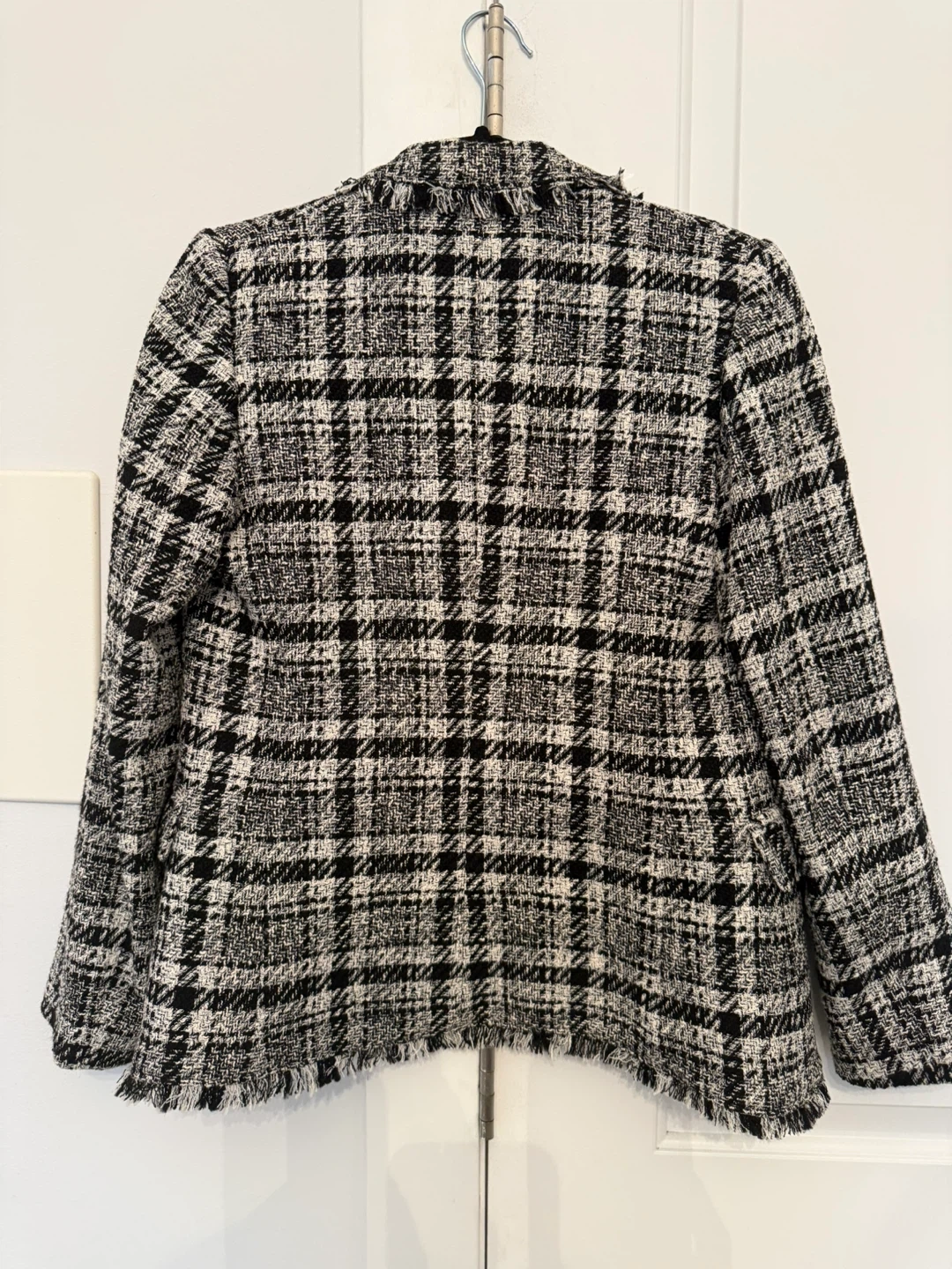 Chic Mango (MNG Suit) tweed blazer/jacket in a classic black & white plaid. Features a structured silhouette, frayed/fringe trim for a designer look, and a smooth fully lined interior—perfect for work, dinners, or elevating jeans and boots.