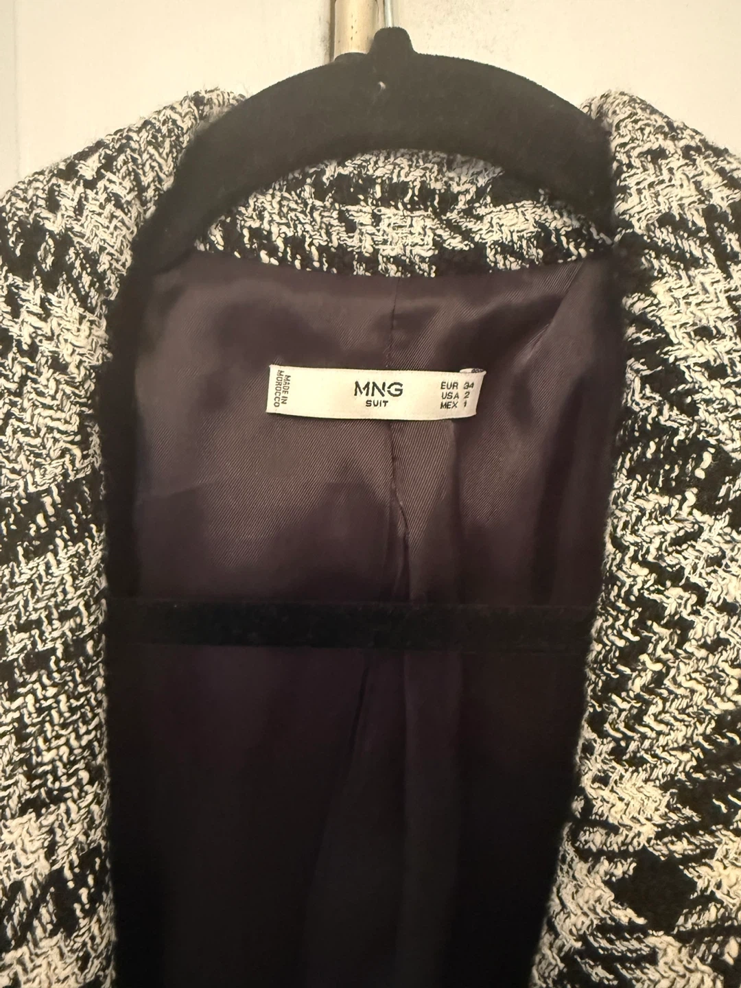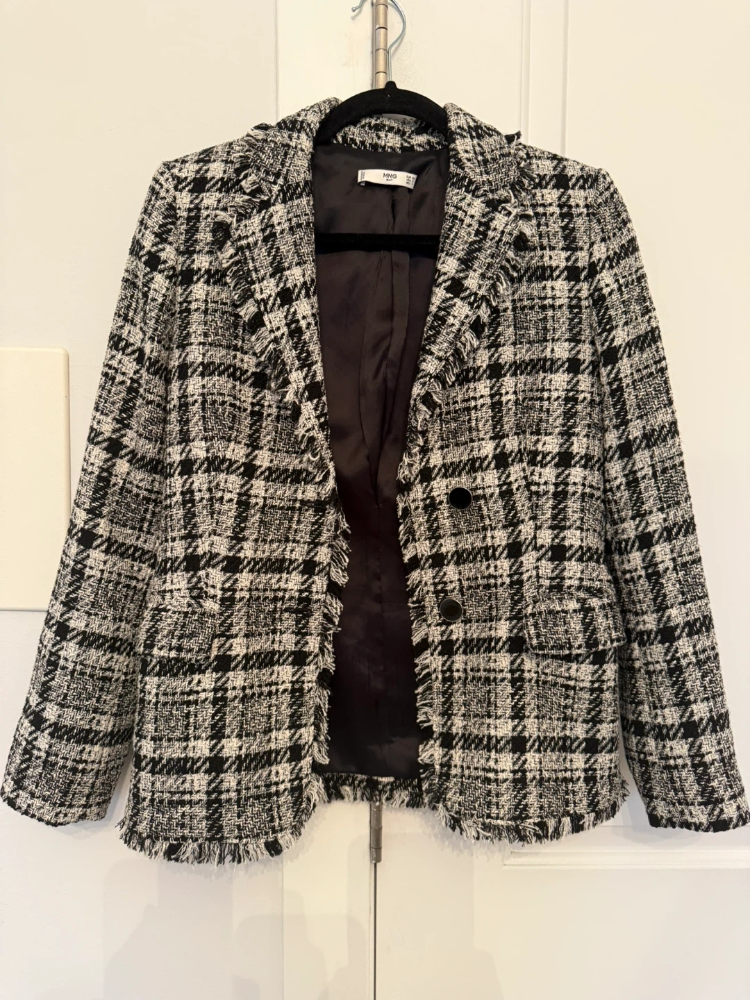 Chic Mango (MNG Suit) tweed blazer/jacket in a classic black & white plaid. Features a structured silhouette, frayed/fringe trim for a designer look, and a smooth fully lined interior—perfect for work, dinners, or elevating jeans and boots.