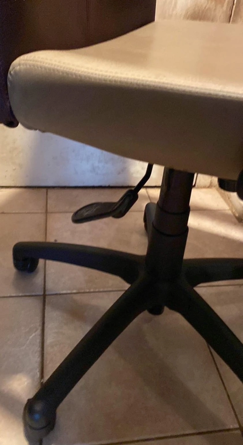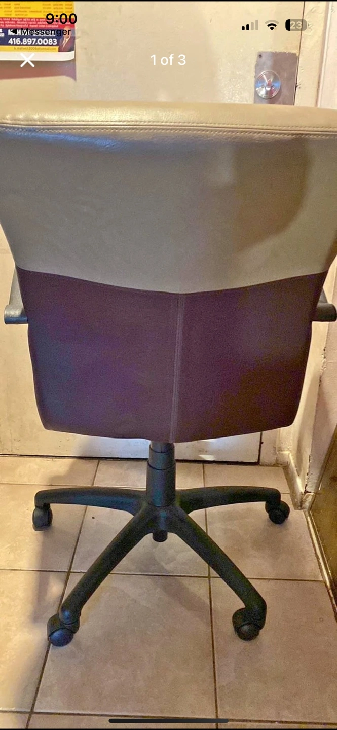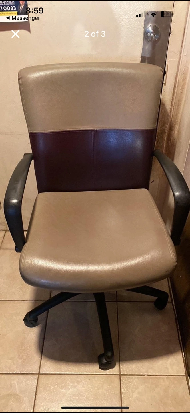 17Comfortable office chair. Beige and burgundy faux leather. Good for home or office use. Dm for details Cash only