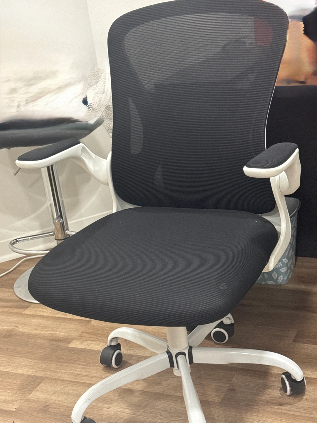 Mesh-backed office chair. Features a black seat and back, with white armrests and base. Offers the support you need, creating a comfortable workspace.