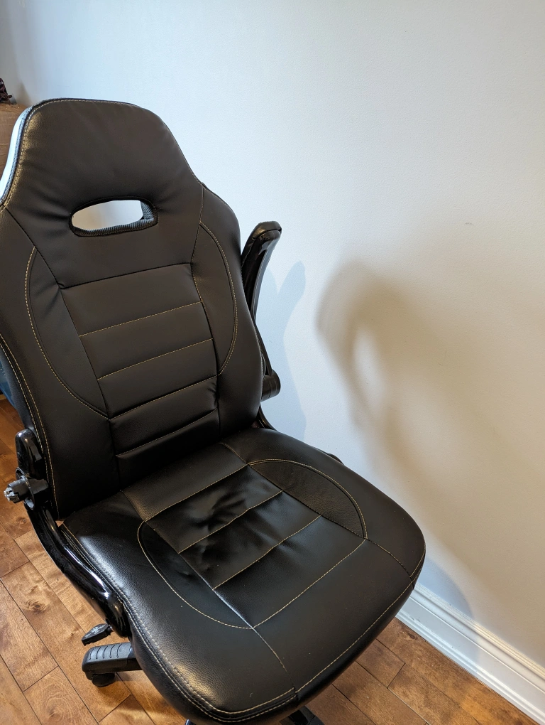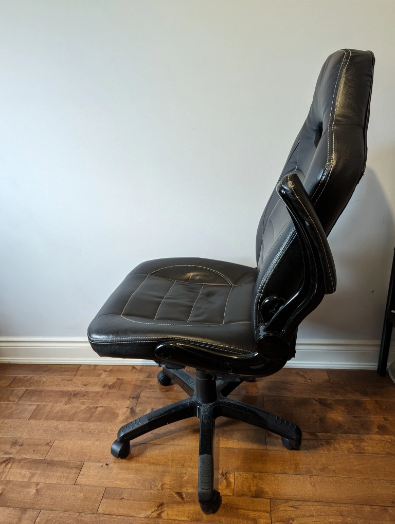 Black office chair with yellow stitching. It has adjustable height and a swivel base. It is in good condition. one hand rest is broken.
